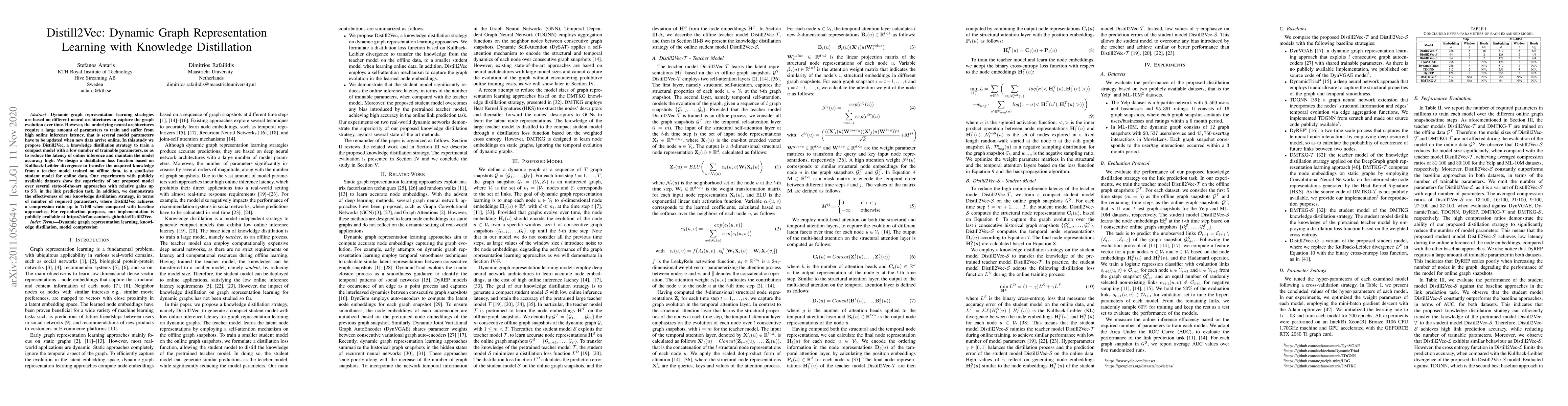 Distill2Vec proposes a knowledge distillation strategy to train a compact model with reduced online inference latency while maintaining high accuracy for dynamic graph representation learning. Experiments show a compression ratio of up to 7:100 and relative gains of up to 5% in link prediction tasks compared to state-of-the-art methods.