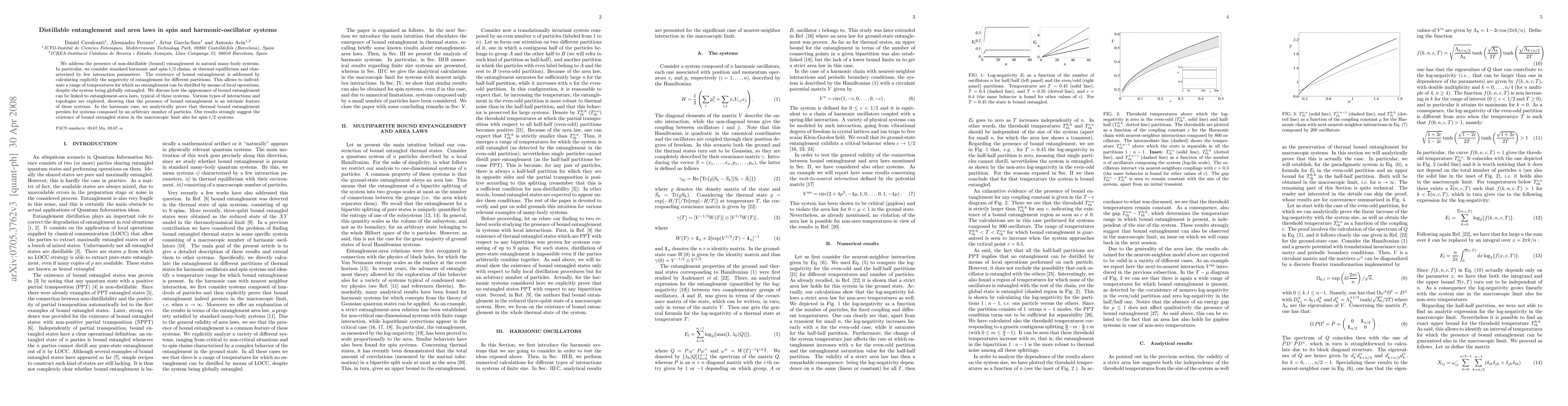 This paper investigates non-distillable entanglement in thermal spin and harmonic oscillator systems, demonstrating that bound entanglement exists despite global entanglement. The study shows that thermal bound entanglement persists across various interactions and topologies, suggesting its presence in macroscopic spin-1/2 systems and analytically proving its existence in harmonic systems.