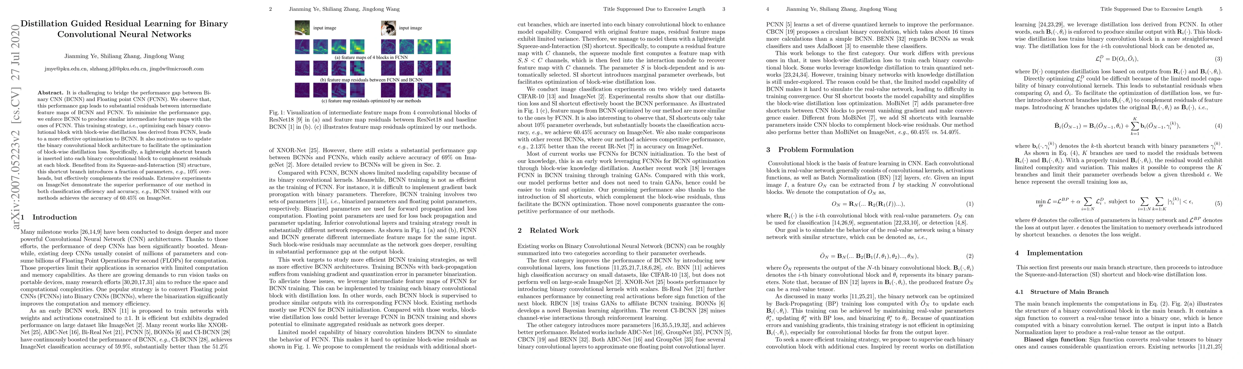 This paper proposes a distillation-guided residual learning approach to bridge the performance gap between Binary Convolutional Neural Networks (BCNN) and Floating point CNNs (FCNN). The method optimizes BCNN by minimizing residuals between intermediate feature maps, using a lightweight shortcut branch with Squeeze-and-Interaction (SI) structure to complement these residuals. Experiments show improved classification efficiency and accuracy, achieving 60.45% on ImageNet.