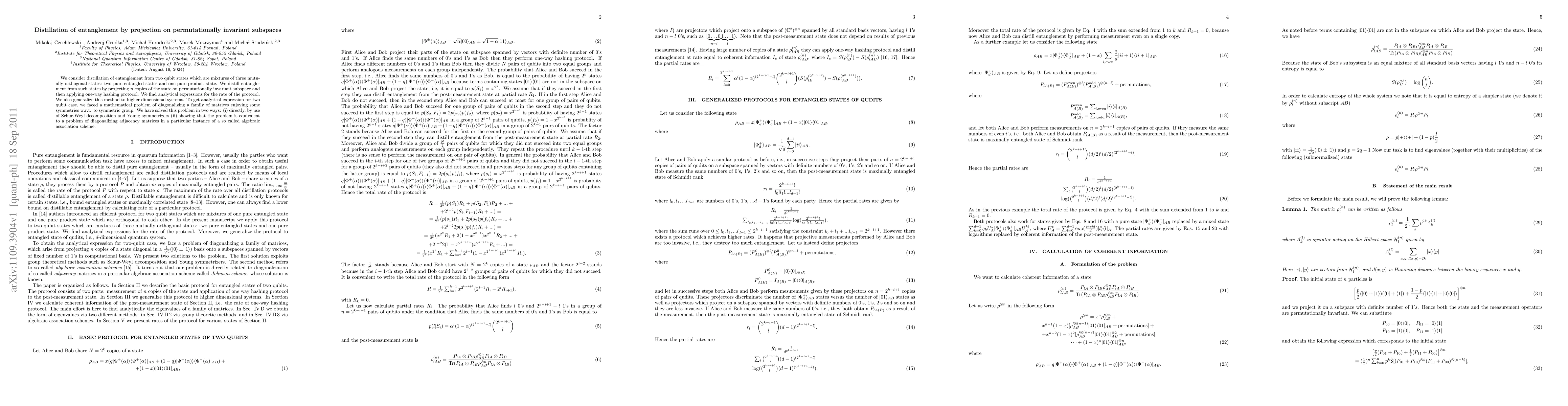 We consider distillation of entanglement from two qubit states which are mixtures of three mutually orthogonal states: two pure entangled states and one pure product state. We distill entanglement from such states by projecting n copies of the state on permutationally invariant subspace and then applying one-way hashing protocol. We find analytical expressions for the rate of the protocol. We also generalize this method to higher dimensional systems. To get analytical expression for two qubit case, we faced a mathematical problem of diagonalizing a family of matrices enjoying some symmetries w.r.t. to symmetric group. We have solved this problem in two ways: (i) directly, by use of Schur-Weyl decomposition and Young symmetrizers (ii) showing that the problem is equivalent to a problem of diagonalizing adjacency matrices in a particular instance of a so called algebraic association scheme.
