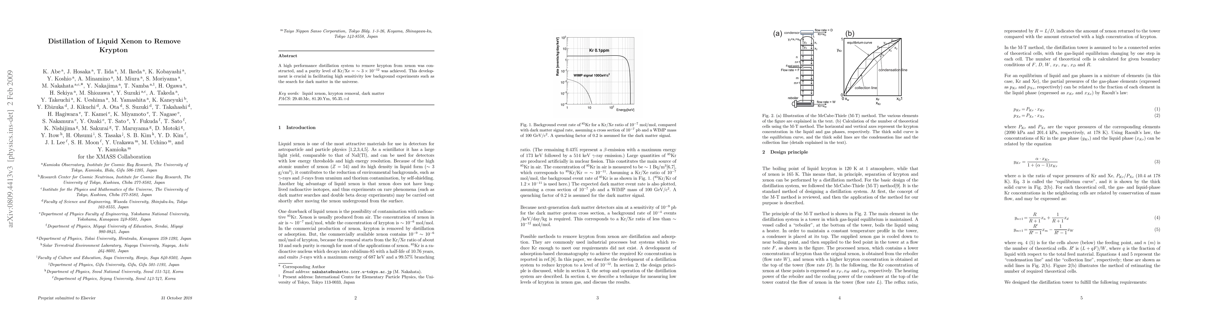 A high-performance distillation system successfully removes krypton from liquid xenon, achieving a purity ratio of Kr/Xe ≈ 3 × 10^-12, essential for sensitive low-background experiments like dark matter detection.