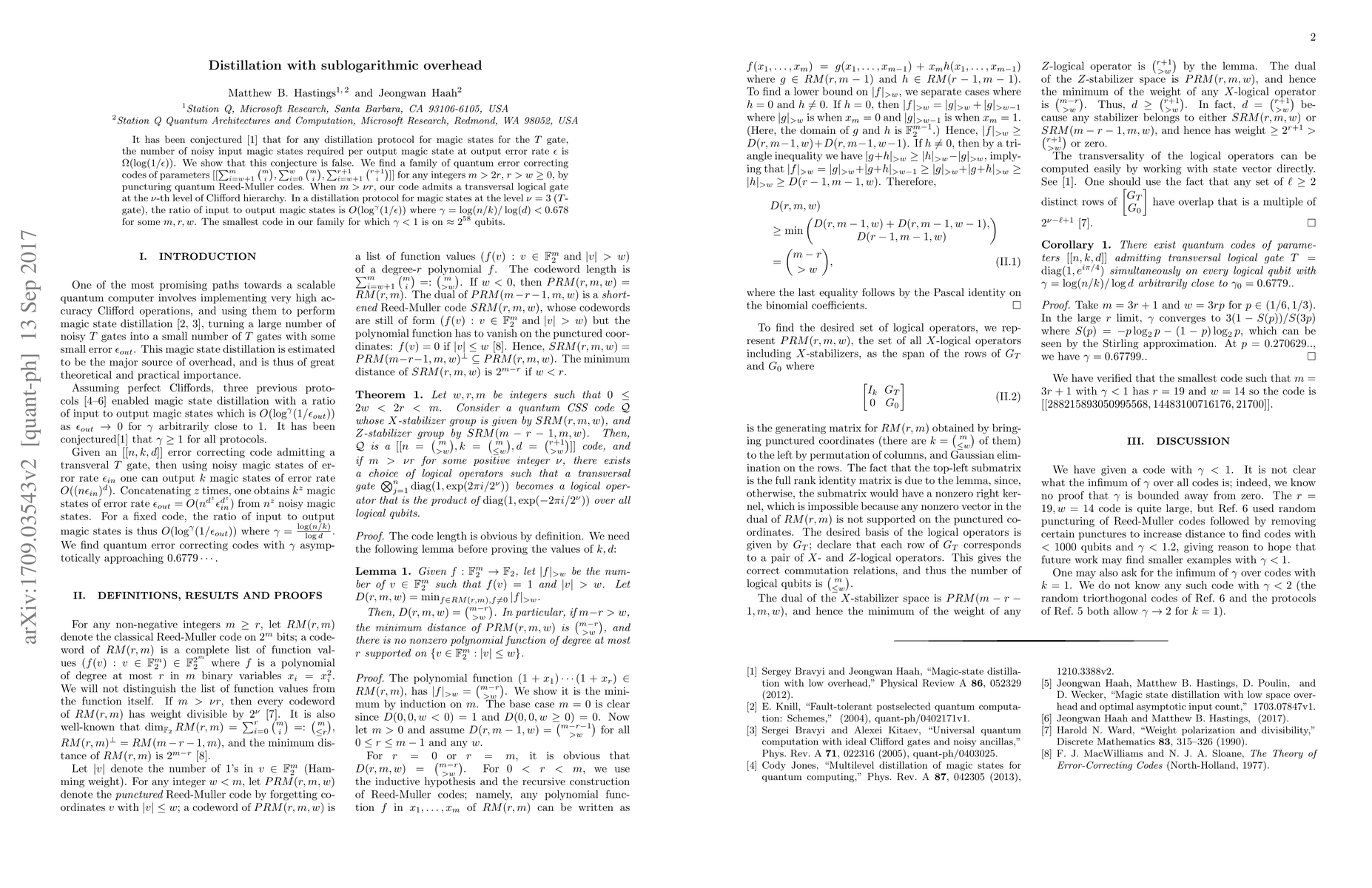 It has been conjectured [1] that for any distillation protocol for magic states for the $T$ gate, the number of noisy input magic states required per output magic state at output error rate $\epsilon$ is $\Omega(\log(1/\epsilon))$. We show that this conjecture is false. We find a family of quantum error correcting codes of parameters $[[\sum_{i=w+1}^m \binom{m}{i}, \sum_{i=0}^{w} \binom{m}{i}, \sum_{i=w+1}^{r+1} \binom{r+1}{i}]]$ for any integers $ m > 2r$, $r > w \ge 0$, by puncturing quantum Reed-Muller codes. When $m > \nu r$, our code admits a transversal logical gate at the $\nu$-th level of Clifford hierarchy. In a distillation protocol for magic states at the level $\nu = 3$ ($T$-gate), the ratio of input to output magic states is $O(\log^\gamma (1/\epsilon))$ where $\gamma = \log(n/k)/\log(d)< 0.678$ for some $m,r,w$. The smallest code in our family for which $\gamma < 1$ is on $\approx 2^{58}$ qubits.