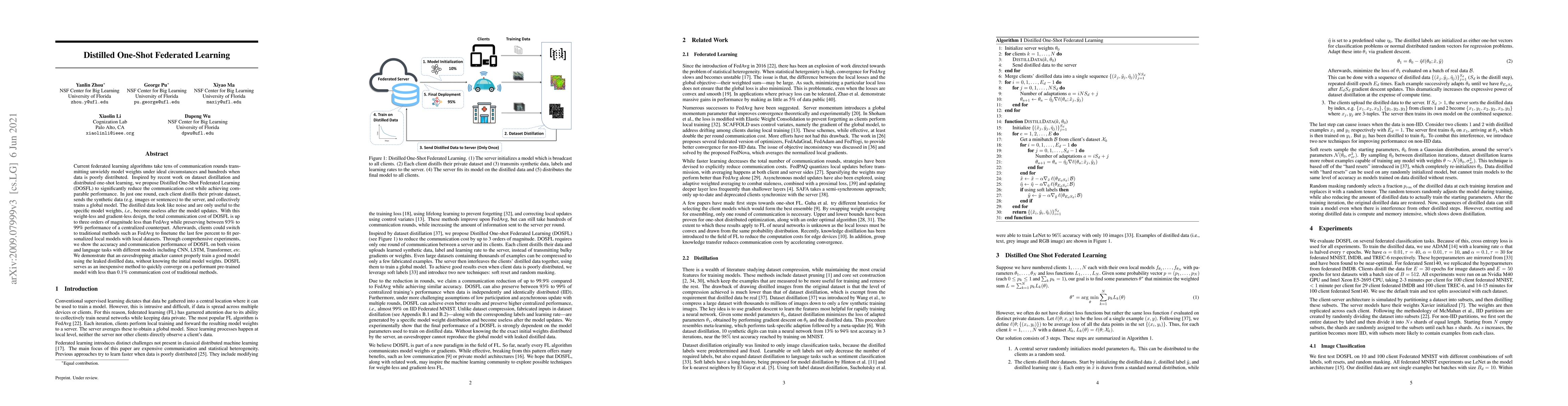 Distilled One-Shot Federated Learning (DOSFL) reduces communication costs by having clients distill synthetic data in one round to train a global model, achieving up to three orders of magnitude less communication than FedAvg while maintaining high performance. DOSFL's distilled data are useless post-update, ensuring security against eavesdropping.