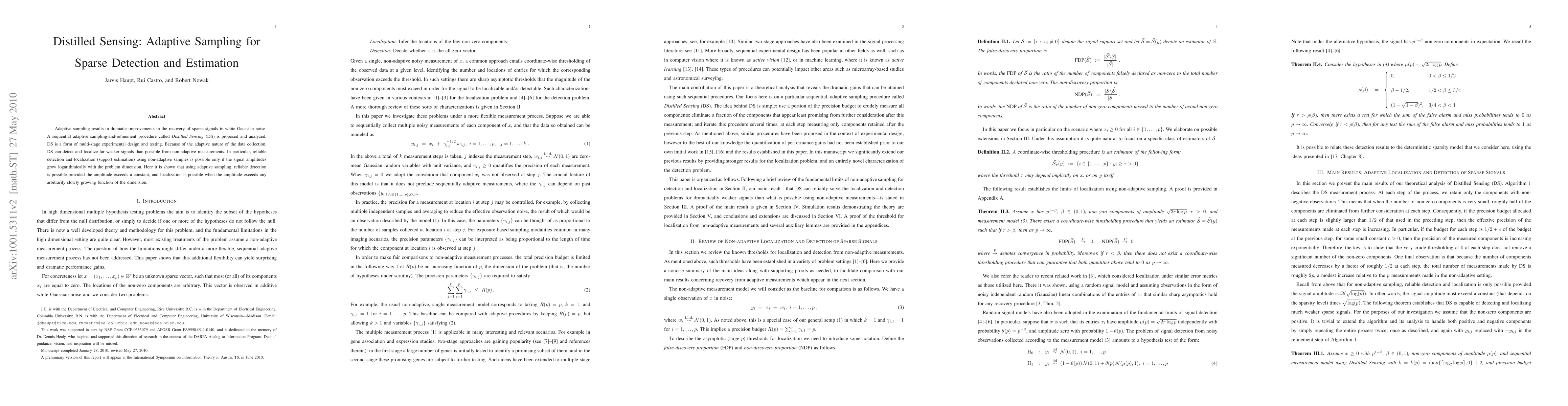 Summary: Distilled Sensing (DS) employs adaptive sampling to significantly enhance the recovery of sparse signals in noise, enabling detection and localization of much weaker signals compared to non-adaptive methods, requiring only a constant signal amplitude for reliable detection and sub-logarithmic growth for localization.