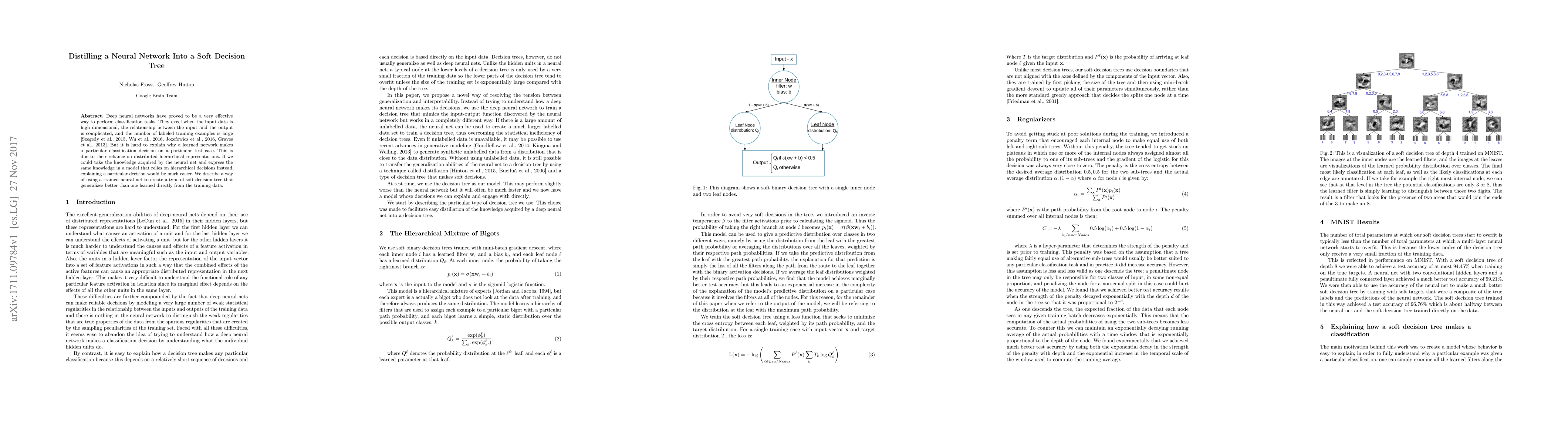 Deep neural networks have proved to be a very effective way to perform classification tasks. They excel when the input data is high dimensional, the relationship between the input and the output is complicated, and the number of labeled training examples is large. But it is hard to explain why a learned network makes a particular classification decision on a particular test case. This is due to their reliance on distributed hierarchical representations. If we could take the knowledge acquired by the neural net and express the same knowledge in a model that relies on hierarchical decisions instead, explaining a particular decision would be much easier. We describe a way of using a trained neural net to create a type of soft decision tree that generalizes better than one learned directly from the training data.