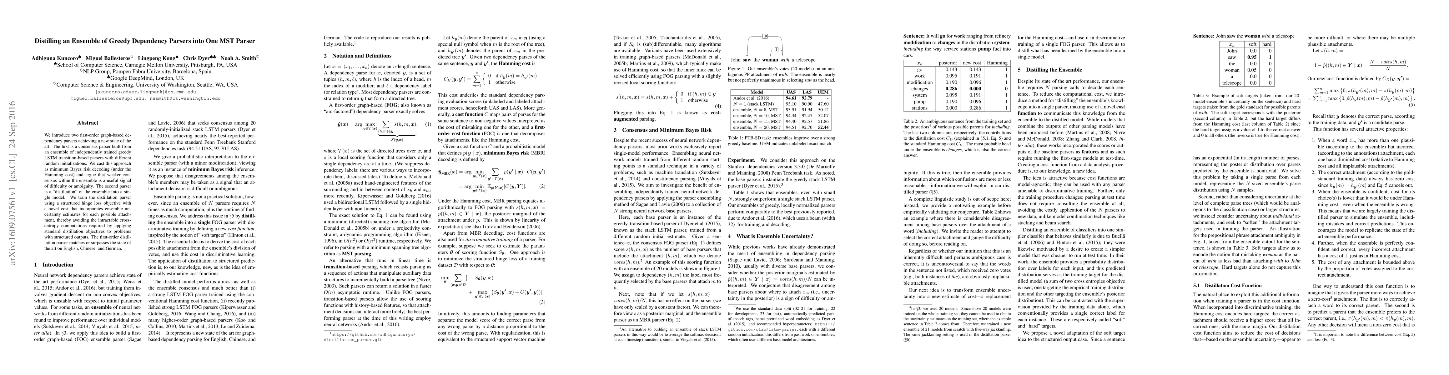 This paper presents two advanced first-order graph-based dependency parsers: a consensus parser from an ensemble of greedy LSTM parsers, and a distilled parser trained using a structured hinge loss that incorporates ensemble uncertainty. The distilled parser achieves or exceeds state-of-the-art performance on English, Chinese, and German datasets.