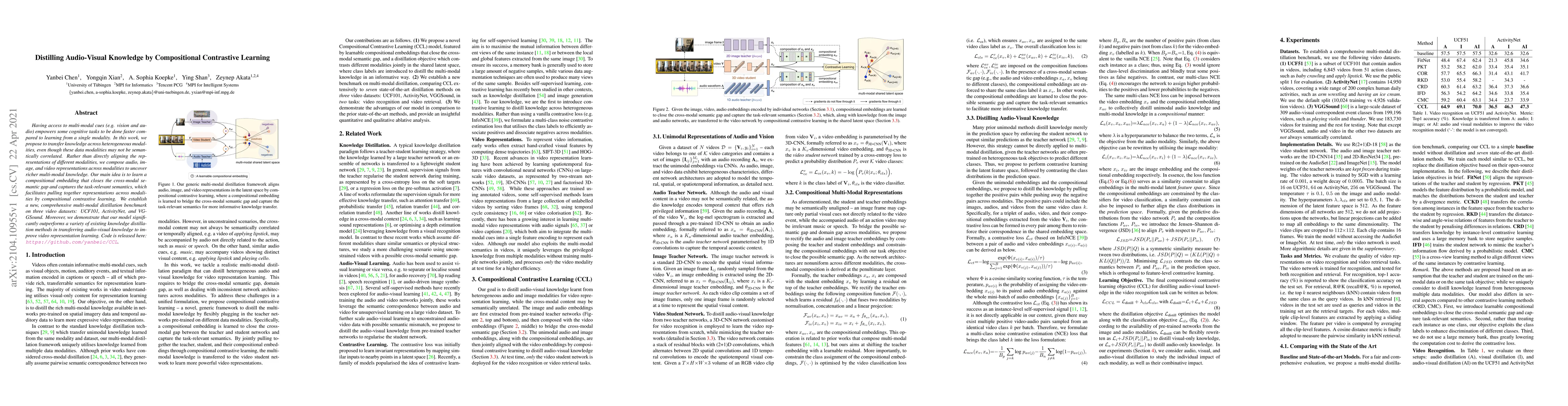 This paper proposes a compositional contrastive learning approach to distill audio-visual knowledge across heterogeneous modalities, achieving superior performance over existing knowledge distillation methods. The method learns a compositional embedding to bridge the cross-modal semantic gap, establishing a new multi-modal distillation benchmark on UCF101, ActivityNet, and VGGSound datasets.