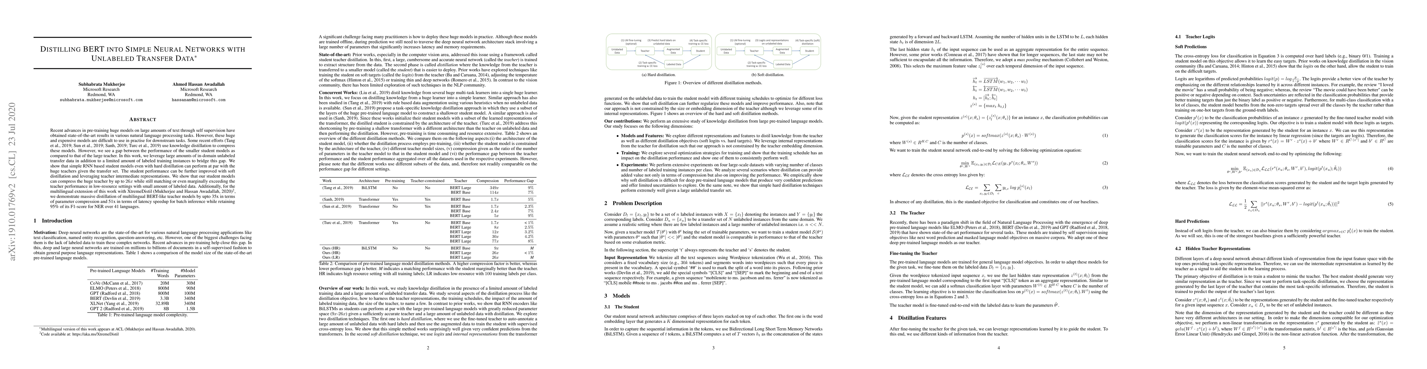 Researchers developed a method to compress large language models like BERT into simpler neural networks using unlabeled transfer data, achieving comparable performance to the original model with up to 35x parameter compression.