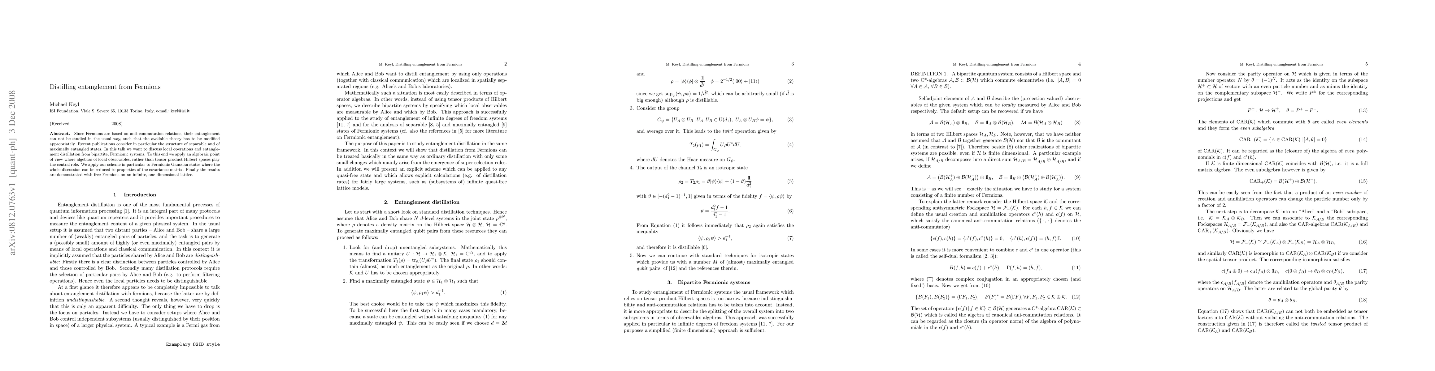 Since Fermions are based on anti-commutation relations, their entanglement can not be studied in the usual way, such that the available theory has to be modified appropriately. Recent publications consider in particular the structure of separable and of maximally entangled states. In this talk we want to discuss local operations and entanglement distillation from bipartite, Fermionic systems. To this end we apply an algebraic point of view where algebras of local observables, rather than tensor product Hilbert spaces play the central role. We apply our scheme in particular to Fermionic Gaussian states where the whole discussion can be reduced to properties of the covariance matrix. Finally the results are demonstrated with free Fermions on an infinite, one-dimensional lattice.