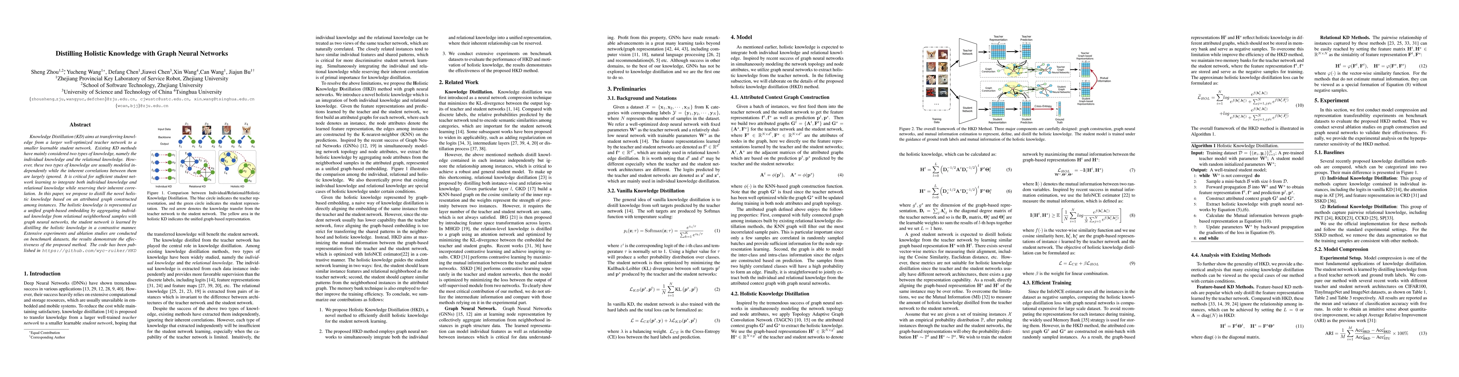 This paper proposes a novel method for Knowledge Distillation that integrates both individual and relational knowledge through graph neural networks, constructing an attributed graph to represent holistic knowledge. The student network learns by distilling this unified graph-based embedding, demonstrating improved performance through extensive experiments on benchmark datasets.