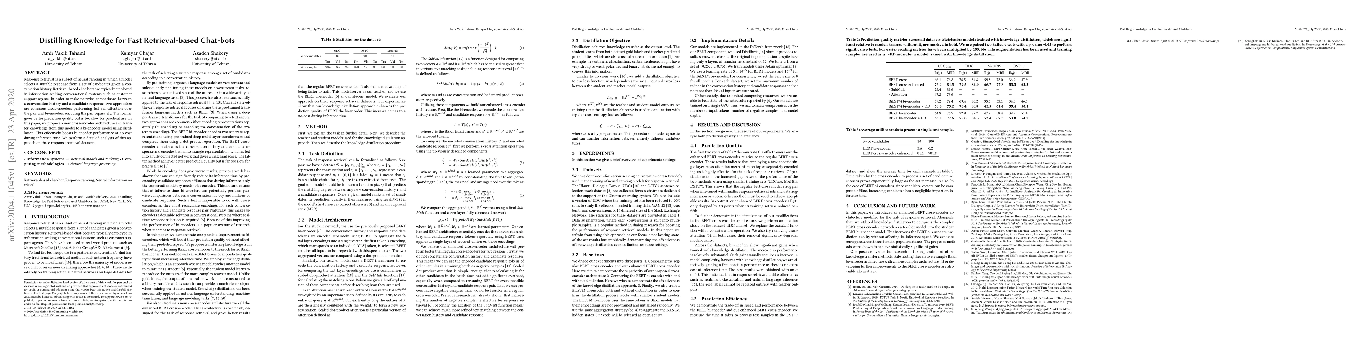Researchers propose a new cross-encoder architecture for fast response retrieval in chat-bots, which improves performance without sacrificing speed, and demonstrate its effectiveness on three datasets.
