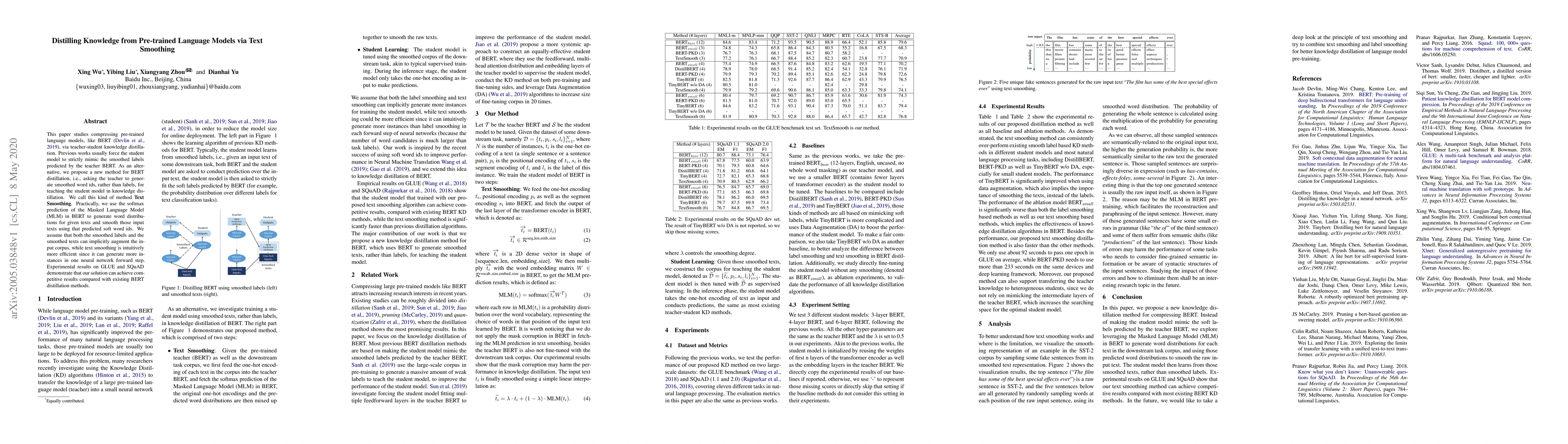 This paper proposes a new method called TextSmoothing for compressing pre-trained language models like BERT through knowledge distillation by generating smoothed word ids instead of labels. Experimental results show competitive performance on GLUE and SQuAD compared to existing distillation methods.