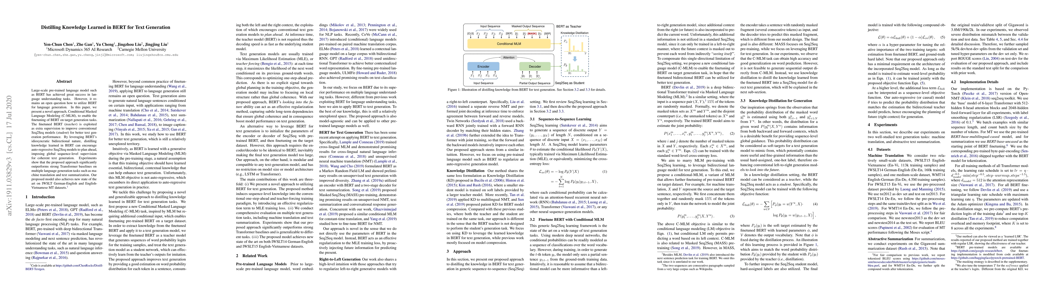 Large-scale pre-trained language model such as BERT has achieved great success in language understanding tasks. However, it remains an open question how to utilize BERT for language generation. In this paper, we present a novel approach, Conditional Masked Language Modeling (C-MLM), to enable the finetuning of BERT on target generation tasks. The finetuned BERT (teacher) is exploited as extra supervision to improve conventional Seq2Seq models (student) for better text generation performance. By leveraging BERT's idiosyncratic bidirectional nature, distilling knowledge learned in BERT can encourage auto-regressive Seq2Seq models to plan ahead, imposing global sequence-level supervision for coherent text generation. Experiments show that the proposed approach significantly outperforms strong Transformer baselines on multiple language generation tasks such as machine translation and text summarization. Our proposed model also achieves new state of the art on IWSLT German-English and English-Vietnamese MT datasets. Code is available at https://github.com/ChenRocks/Distill-BERT-Textgen.