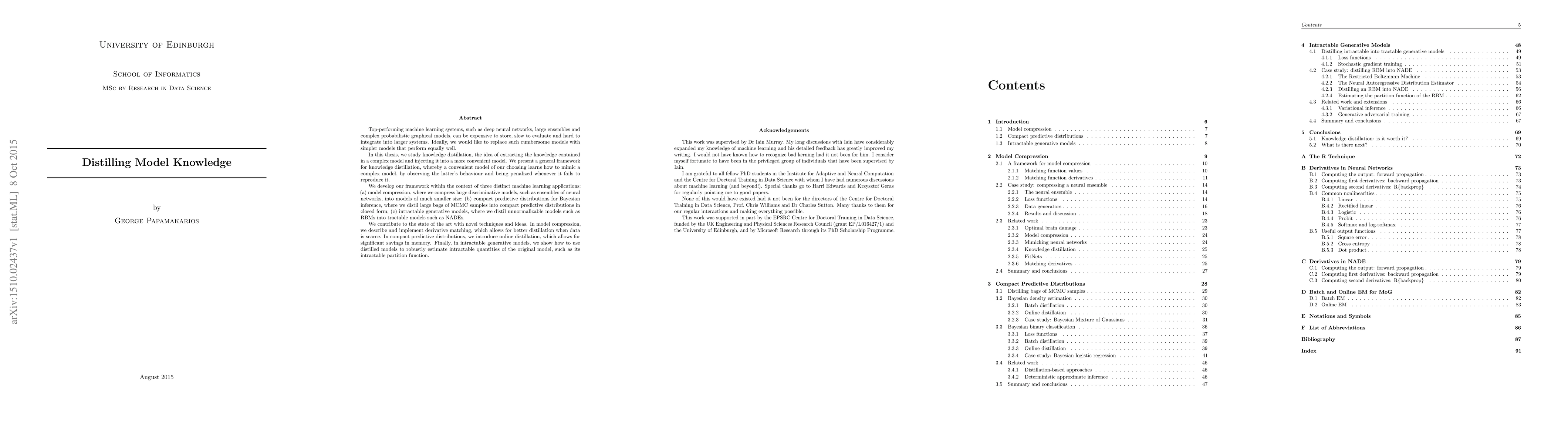 Top-performing machine learning systems, such as deep neural networks, large ensembles and complex probabilistic graphical models, can be expensive to store, slow to evaluate and hard to integrate into larger systems. Ideally, we would like to replace such cumbersome models with simpler models that perform equally well. In this thesis, we study knowledge distillation, the idea of extracting the knowledge contained in a complex model and injecting it into a more convenient model. We present a general framework for knowledge distillation, whereby a convenient model of our choosing learns how to mimic a complex model, by observing the latter's behaviour and being penalized whenever it fails to reproduce it. We develop our framework within the context of three distinct machine learning applications: (a) model compression, where we compress large discriminative models, such as ensembles of neural networks, into models of much smaller size; (b) compact predictive distributions for Bayesian inference, where we distil large bags of MCMC samples into compact predictive distributions in closed form; (c) intractable generative models, where we distil unnormalizable models such as RBMs into tractable models such as NADEs. We contribute to the state of the art with novel techniques and ideas. In model compression, we describe and implement derivative matching, which allows for better distillation when data is scarce. In compact predictive distributions, we introduce online distillation, which allows for significant savings in memory. Finally, in intractable generative models, we show how to use distilled models to robustly estimate intractable quantities of the original model, such as its intractable partition function.