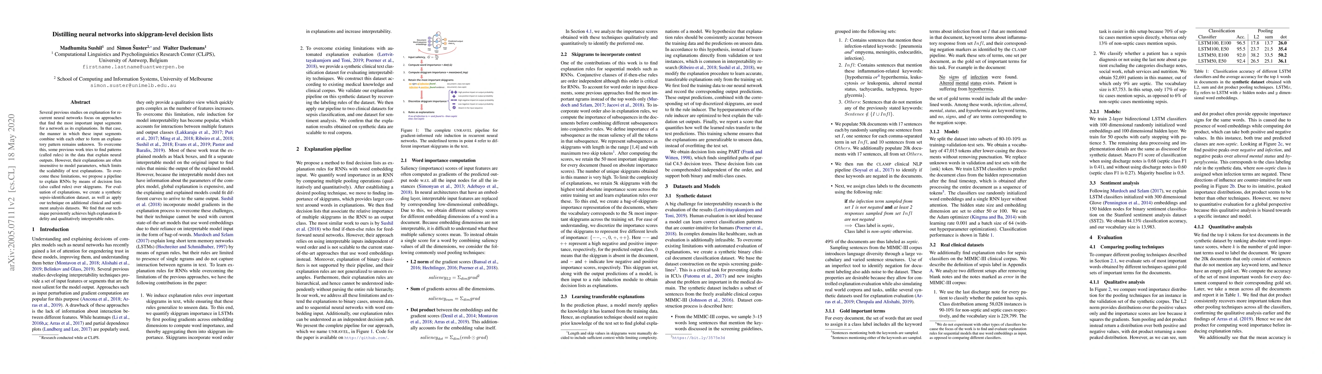 This paper proposes a method to explain recurrent neural networks (RNNs) by distilling them into skipgram-level decision lists, offering scalable and interpretable rules that maintain high fidelity and are evaluated on synthetic and real datasets. The approach aims to address the limitations of previous methods that lack sensitivity to model parameters.