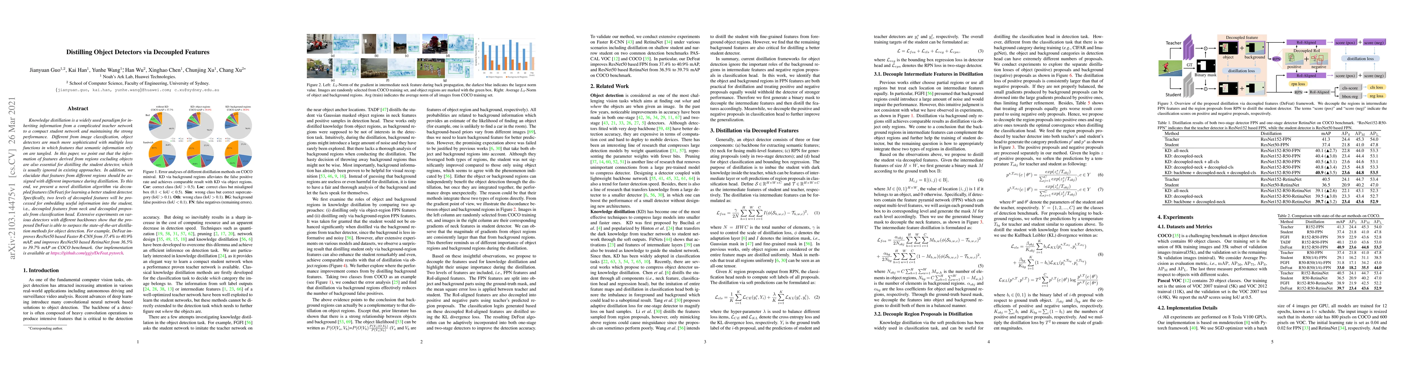 This paper introduces a novel distillation method called DeFeat that enhances student object detectors by distilling information from both regions including and excluding objects. The proposed method decouples features from the detector’s neck and classification head, assigning different importance to features from different regions, and achieves state-of-the-art results on COCO, improving mAP scores significantly for various backbones.