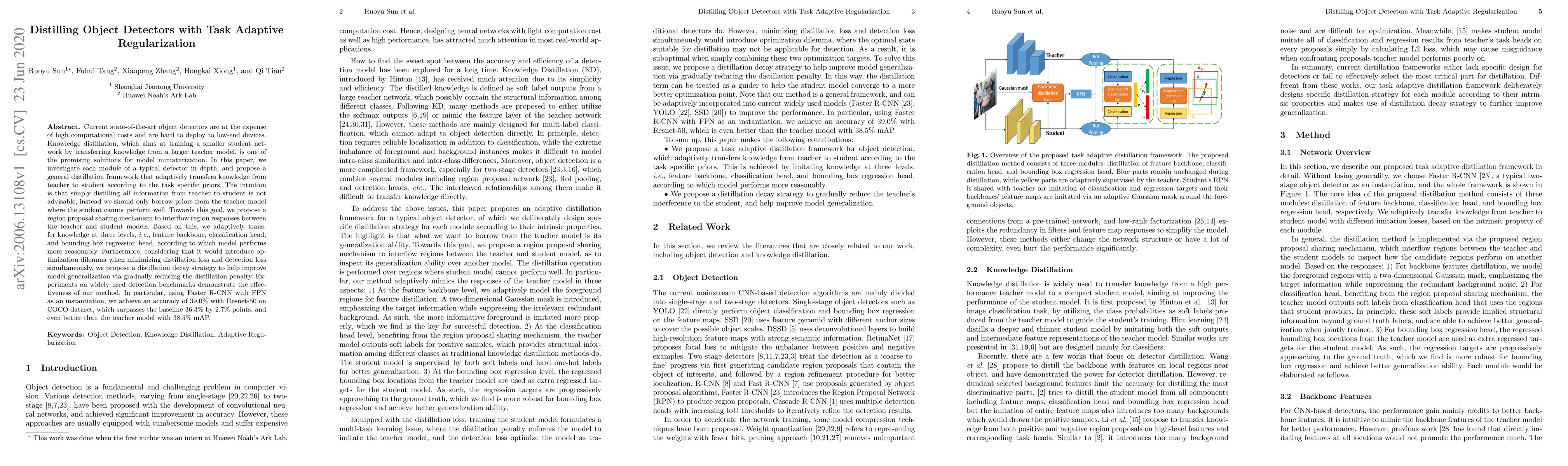 This paper proposes a knowledge distillation framework for object detectors, focusing on task-adaptive regularization to minimize computational costs while maintaining accuracy. The method selectively transfers knowledge from a teacher to a student model based on performance, achieving better accuracy on benchmarks compared to both the baseline and the teacher model.