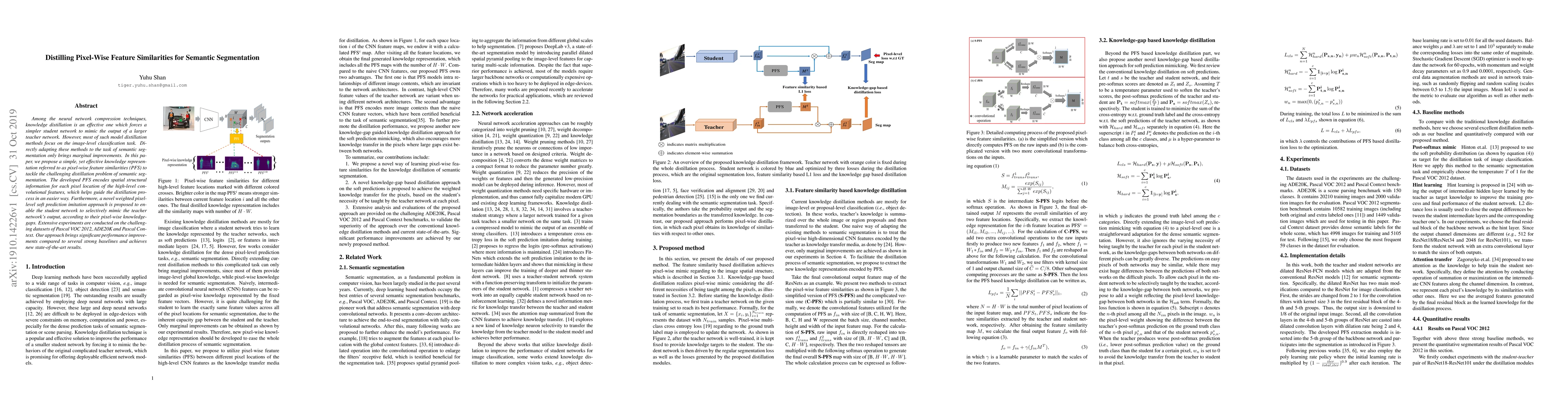 This paper proposes a novel method for knowledge distillation in semantic segmentation using pixel-wise feature similarities (PFS) to encode spatial structural information, and a weighted imitation approach to enhance student network performance, achieving state-of-the-art results on Pascal VOC 2012, ADE20K, and Pascal Context datasets.
