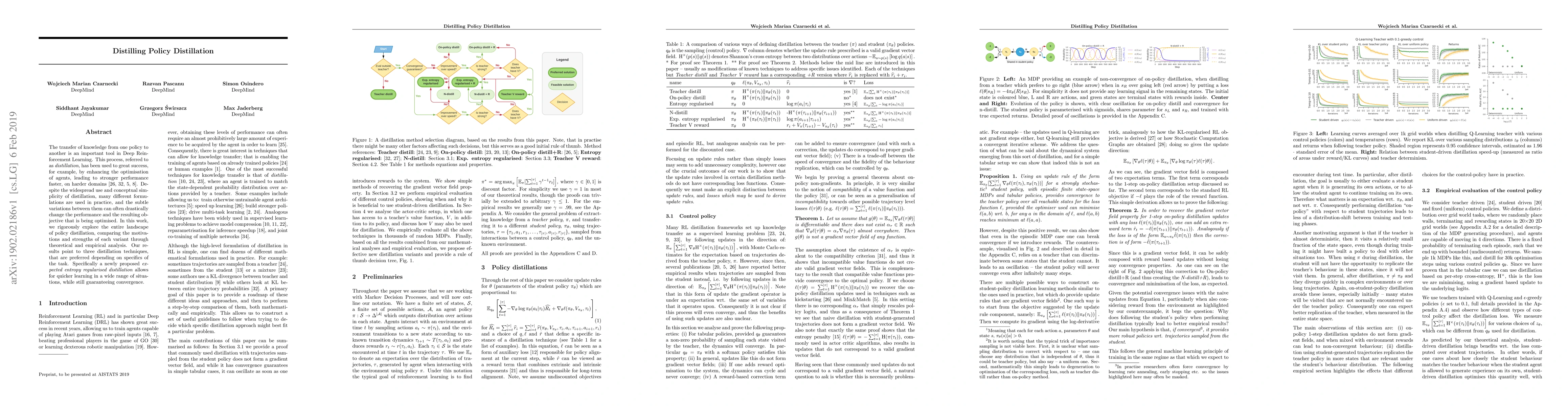 The transfer of knowledge from one policy to another is an important tool in Deep Reinforcement Learning. This process, referred to as distillation, has been used to great success, for example, by enhancing the optimisation of agents, leading to stronger performance faster, on harder domains [26, 32, 5, 8]. Despite the widespread use and conceptual simplicity of distillation, many different formulations are used in practice, and the subtle variations between them can often drastically change the performance and the resulting objective that is being optimised. In this work, we rigorously explore the entire landscape of policy distillation, comparing the motivations and strengths of each variant through theoretical and empirical analysis. Our results point to three distillation techniques, that are preferred depending on specifics of the task. Specifically a newly proposed expected entropy regularised distillation allows for quicker learning in a wide range of situations, while still guaranteeing convergence.