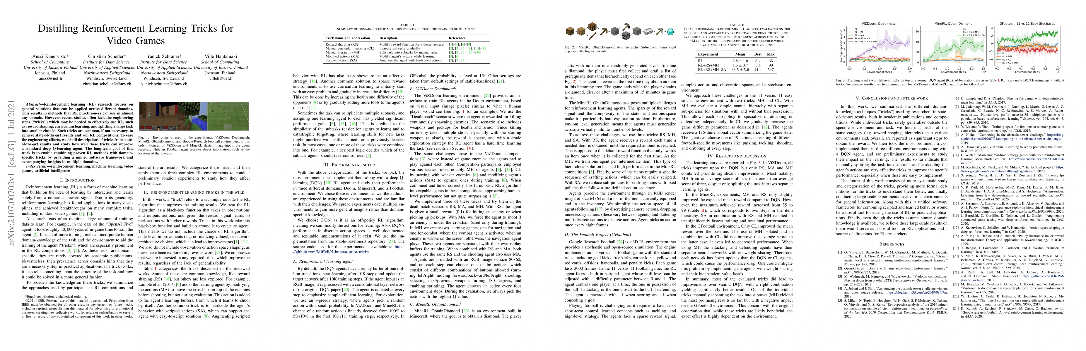 Reinforcement learning (RL) research focuses on general solutions that can be applied across different domains. This results in methods that RL practitioners can use in almost any domain. However, recent studies often lack the engineering steps ("tricks") which may be needed to effectively use RL, such as reward shaping, curriculum learning, and splitting a large task into smaller chunks. Such tricks are common, if not necessary, to achieve state-of-the-art results and win RL competitions. To ease the engineering efforts, we distill descriptions of tricks from state-of-the-art results and study how well these tricks can improve a standard deep Q-learning agent. The long-term goal of this work is to enable combining proven RL methods with domain-specific tricks by providing a unified software framework and accompanying insights in multiple domains.