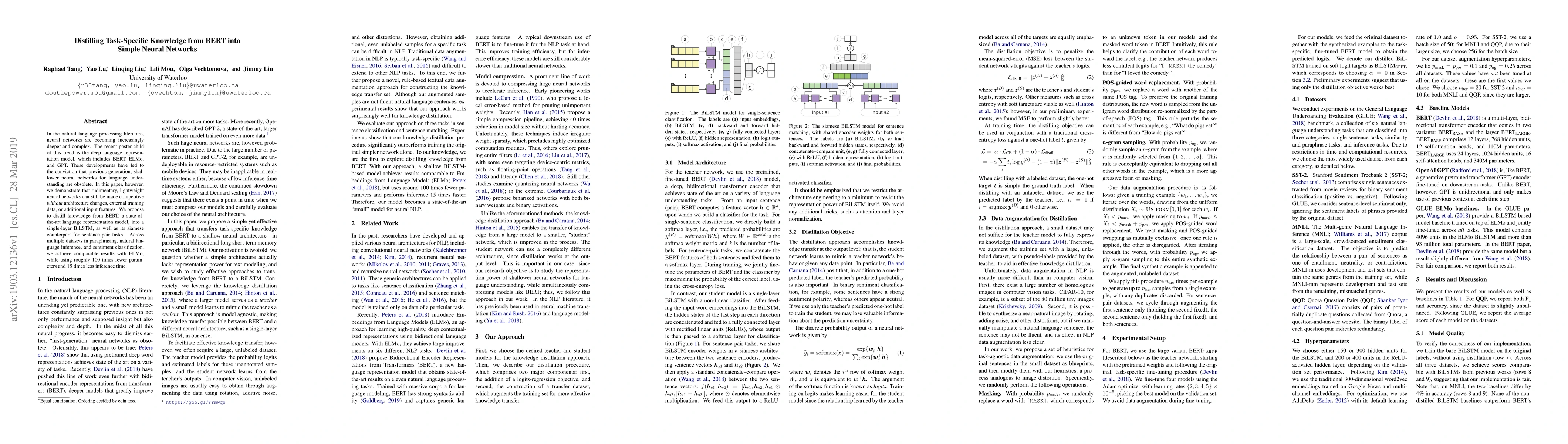 The paper presents a distillation method to transfer knowledge from BERT to a simple BiLSTM, preserving performance with significantly fewer parameters and faster inference.