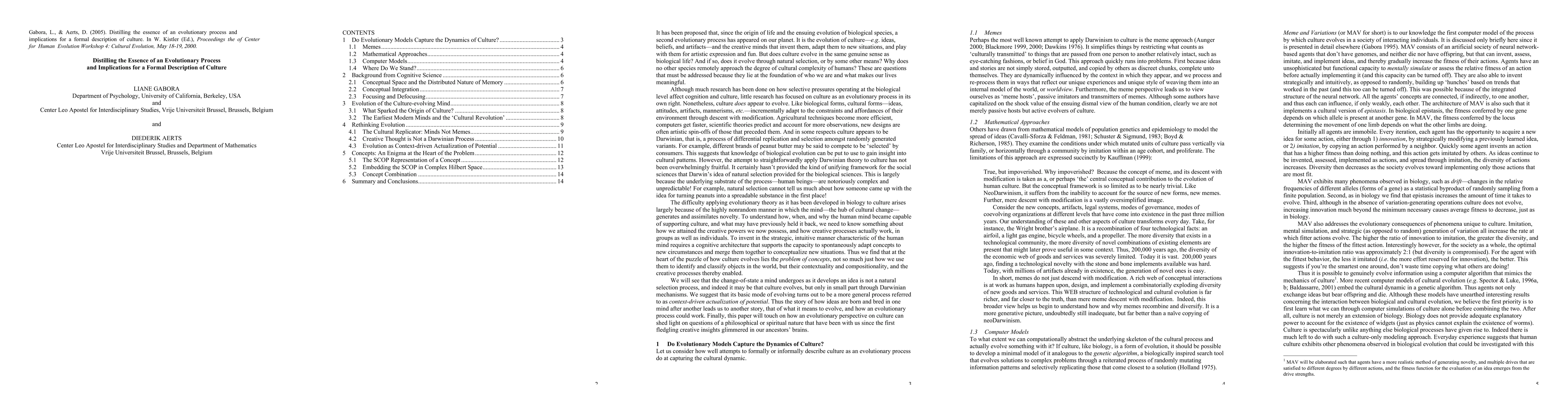 It has been proposed that, since the origin of life and the ensuing evolution of biological species, a second evolutionary process has appeared on our planet. It is the evolution of culture-e.g., ideas, beliefs, and artifacts. Does culture evolve in the same genuine sense as biological life? And if so, does it evolve through natural selection, or by some other means? Why does no other species remotely approach the degree of cultural complexity of humans? These questions lie at the foundation of who we are and what makes our lives meaningful. Although much research has been done on how selective pressures operating at the biological level affect cognition and culture, little research has focused on culture as an evolutionary process in its own right. Like biological forms, cultural forms-ideas, attitudes, artifacts, mannerisms, etc.-incrementally adapt to the constraints and affordances of their environment through descent with modification. In some respects culture appears to be Darwinian, i.e., a process of differential replication and selection amongst randomly generated variants. This suggests that knowledge of biological evolution can be put to use to gain insight into culture. However, attempts to apply Darwinian theory to culture have not yielded the kind of unifying framework for the social sciences that it provided for the biological sciences, largely because of the nonrandom manner in which the mind-the hub of cultural change-generates and assimilates novelty. This paper investigates how and when humans became capable of supporting culture, and what previously held it back, focusing on how we attained the creative powers we now possess. To invent in the strategic, intuitive manner characteristic of humans requires a cognitive architecture that supports the capacity to spontaneously adapt concepts to new circumstances and merge them together to conceptualize new situations.
