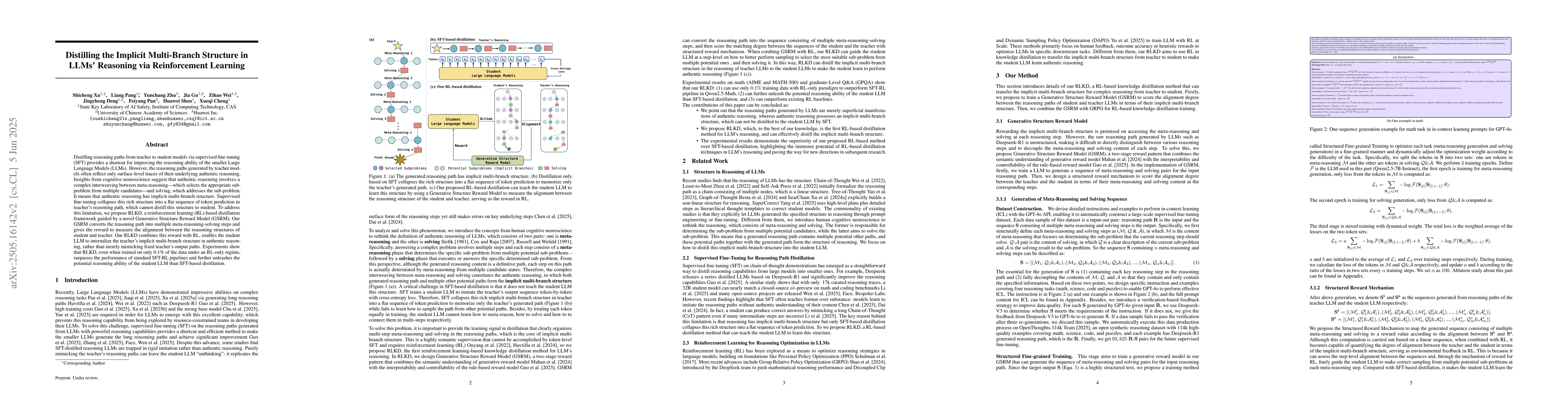 Distilling reasoning paths from teacher to student models via supervised fine-tuning (SFT) provides a shortcut for improving the reasoning ability of smaller Large Language Models (LLMs). However, the reasoning paths generated by teacher models often reflect only surface-level traces of their underlying authentic reasoning. Insights from cognitive neuroscience suggest that authentic reasoning involves a complex interweaving between meta-reasoning (which selects appropriate sub-problems from multiple candidates) and solving (which addresses the sub-problem). This implies authentic reasoning has an implicit multi-branch structure. Supervised fine-tuning collapses this rich structure into a flat sequence of token prediction in the teacher's reasoning path, preventing effective distillation of this structure to students. To address this limitation, we propose RLKD, a reinforcement learning (RL)-based distillation framework guided by a novel Generative Structure Reward Model (GSRM). Our GSRM converts reasoning paths into multiple meta-reasoning-solving steps and computes rewards to measure structural alignment between student and teacher reasoning. RLKD combines this reward with RL, enabling student LLMs to internalize the teacher's implicit multi-branch reasoning structure rather than merely mimicking fixed output paths. Experiments show RLKD surpasses standard SFT-RL pipelines even when trained on 0.1% of data under an RL-only regime, unlocking greater student reasoning potential than SFT-based distillation.
