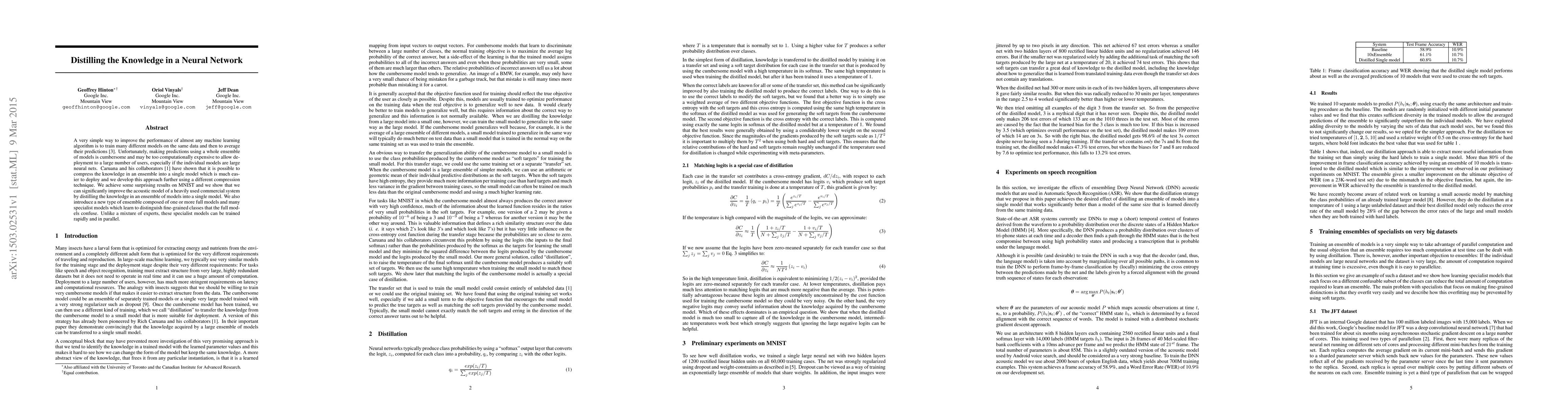 This paper proposes a method to distill knowledge from an ensemble of neural networks into a single, more efficient model, demonstrating improved performance on MNIST and a commercial acoustic model. It introduces a new ensemble type combining full and specialist models, which can be trained quickly and in parallel.