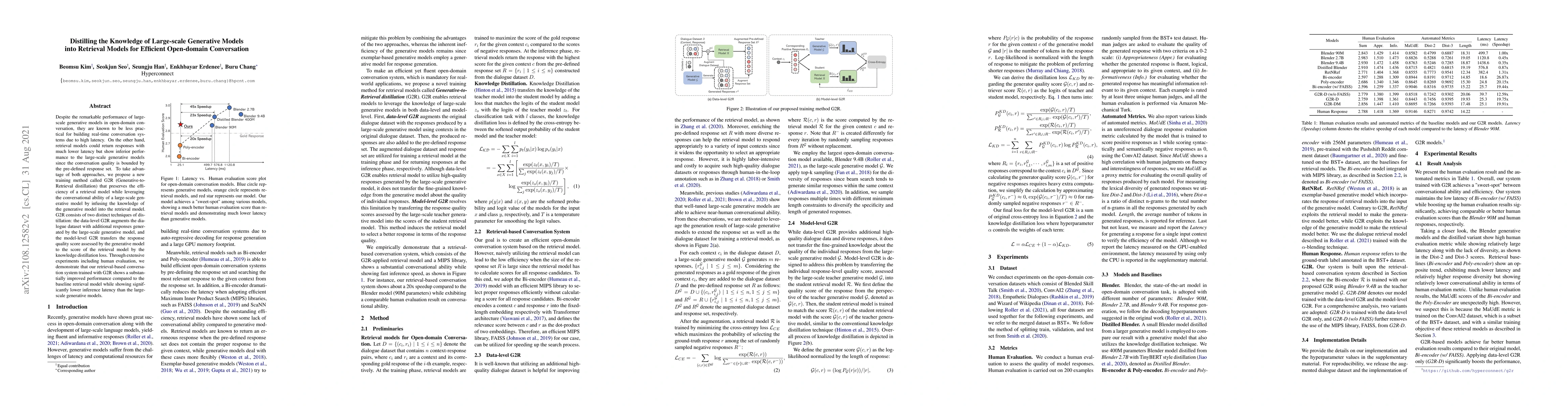 This paper proposes G2R, a method to distill knowledge from large-scale generative models into retrieval models, enhancing the efficiency and performance of open-domain conversation systems. The G2R technique combines data-level augmentation and model-level knowledge transfer, resulting in improved response quality and lower latency compared to both baseline retrieval models and generative models.