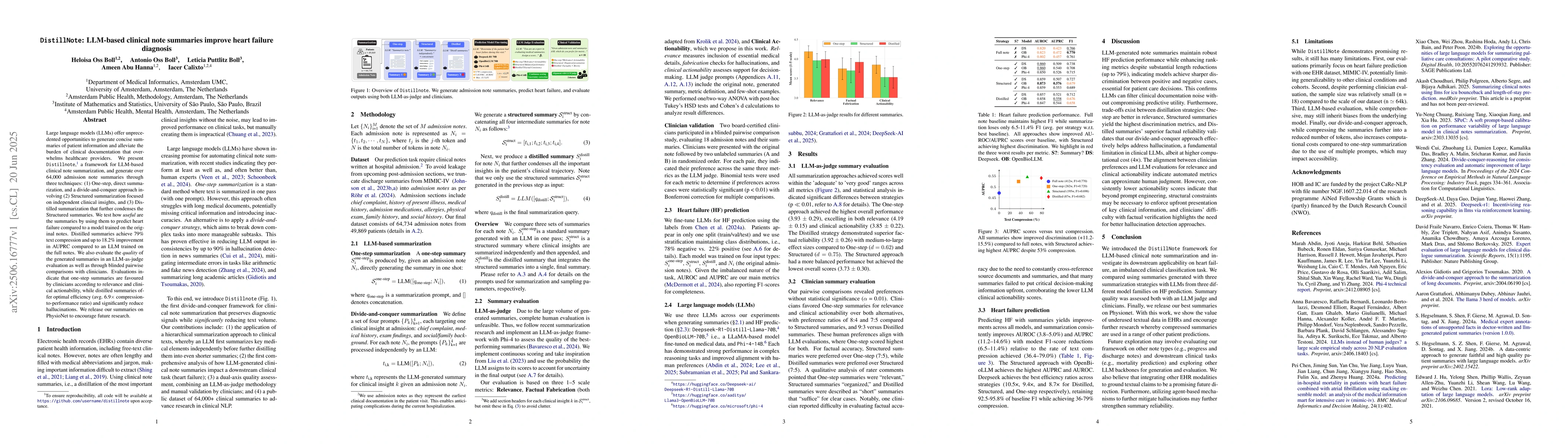 Large language models (LLMs) offer unprecedented opportunities to generate concise summaries of patient information and alleviate the burden of clinical documentation that overwhelms healthcare providers. We present Distillnote, a framework for LLM-based clinical note summarization, and generate over 64,000 admission note summaries through three techniques: (1) One-step, direct summarization, and a divide-and-conquer approach involving (2) Structured summarization focused on independent clinical insights, and (3) Distilled summarization that further condenses the Structured summaries. We test how useful are the summaries by using them to predict heart failure compared to a model trained on the original notes. Distilled summaries achieve 79% text compression and up to 18.2% improvement in AUPRC compared to an LLM trained on the full notes. We also evaluate the quality of the generated summaries in an LLM-as-judge evaluation as well as through blinded pairwise comparisons with clinicians. Evaluations indicate that one-step summaries are favoured by clinicians according to relevance and clinical actionability, while distilled summaries offer optimal efficiency (avg. 6.9x compression-to-performance ratio) and significantly reduce hallucinations. We release our summaries on PhysioNet to encourage future research.