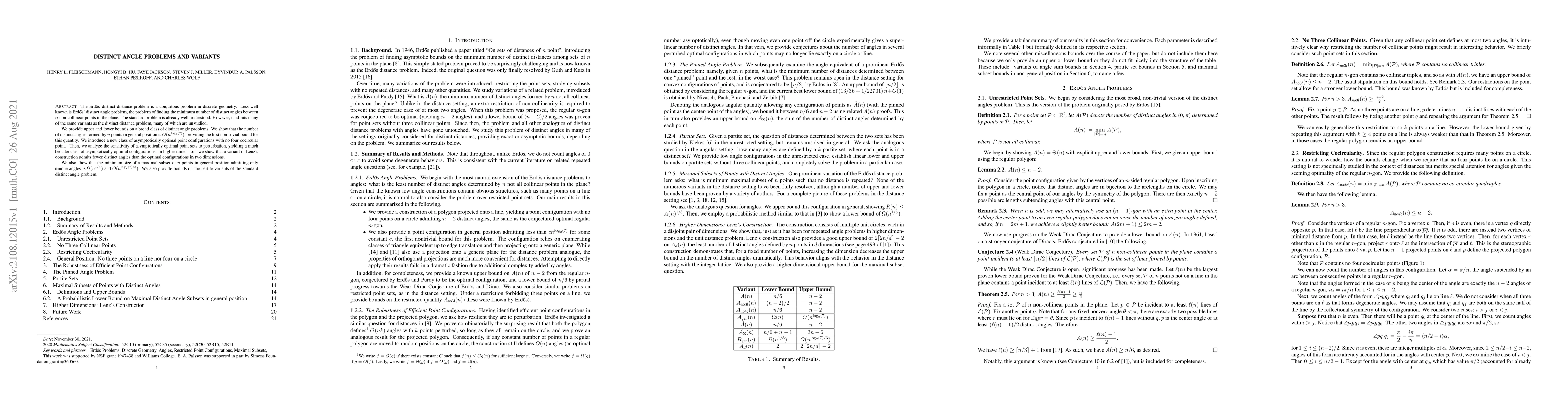 This paper presents bounds for ErdH{o}s' distinct angle problem, showing that the number of distinct angles formed by n non-collinear points is O(n^(log_2(7))), introducing new optimal point configurations, and demonstrating that the minimum size of a subset with unique angles is Ω(n^(1/5)) and O(n^(log_2(7)/3)). It also explores partite variants of the problem.