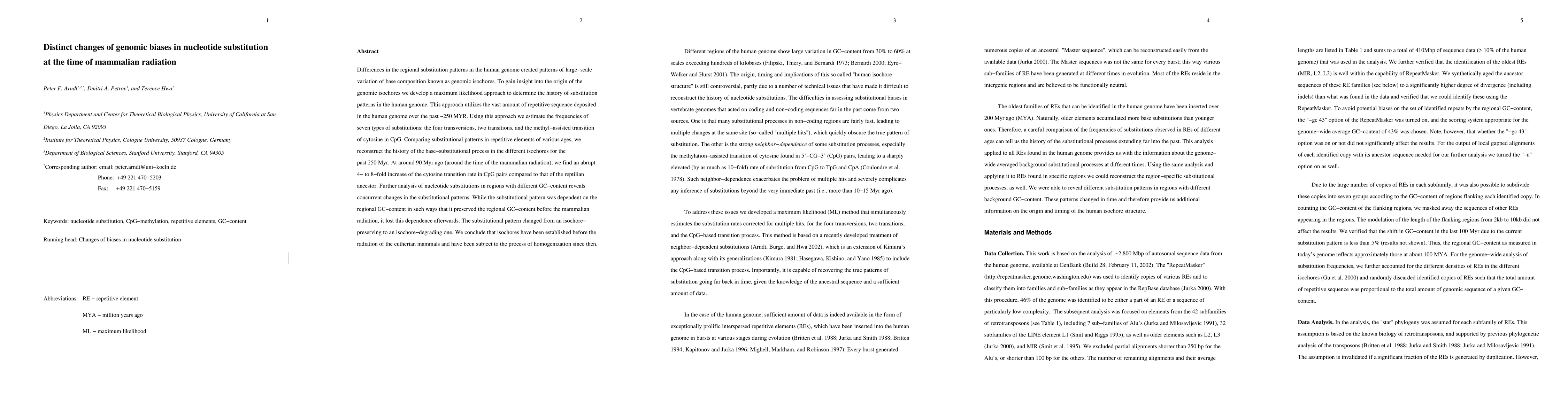 This study uses a maximum likelihood approach to analyze substitution patterns in human genome repetitive sequences over 250 million years. It reveals a significant increase in cytosine transition rate in CpG pairs around 90 million years ago, coinciding with the mammalian radiation. Post-radiation, substitution patterns shifted from preserving to degrading regional GC-content, suggesting isochores existed before eutherian mammal radiation and have since homogenized.