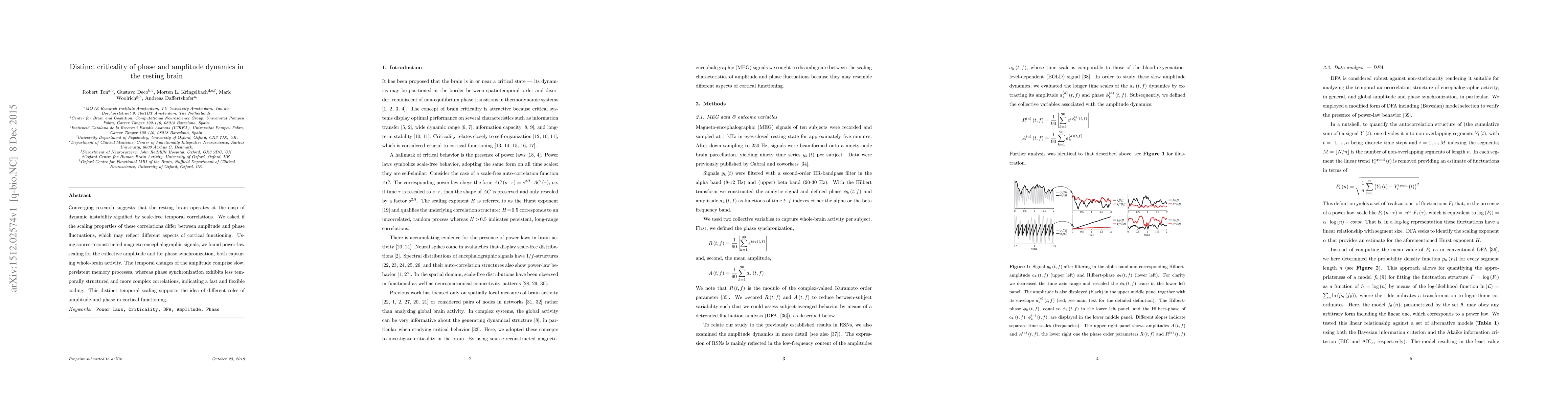 Converging research suggests that the resting brain operates at the cusp of dynamic instability signified by scale-free temporal correlations. We asked if the scaling properties of these correlations differ between amplitude and phase fluctuations, which may reflect different aspects of cortical functioning. Using source-reconstructed magneto-encephalographic signals, we found power-law scaling for the collective amplitude and for phase synchronization, both capturing whole-brain activity. The temporal changes of the amplitude comprise slow, persistent memory processes, whereas phase synchronization exhibits less temporally structured and more complex correlations, indicating a fast and flexible coding. This distinct temporal scaling supports the idea of different roles of amplitude and phase in cortical functioning.