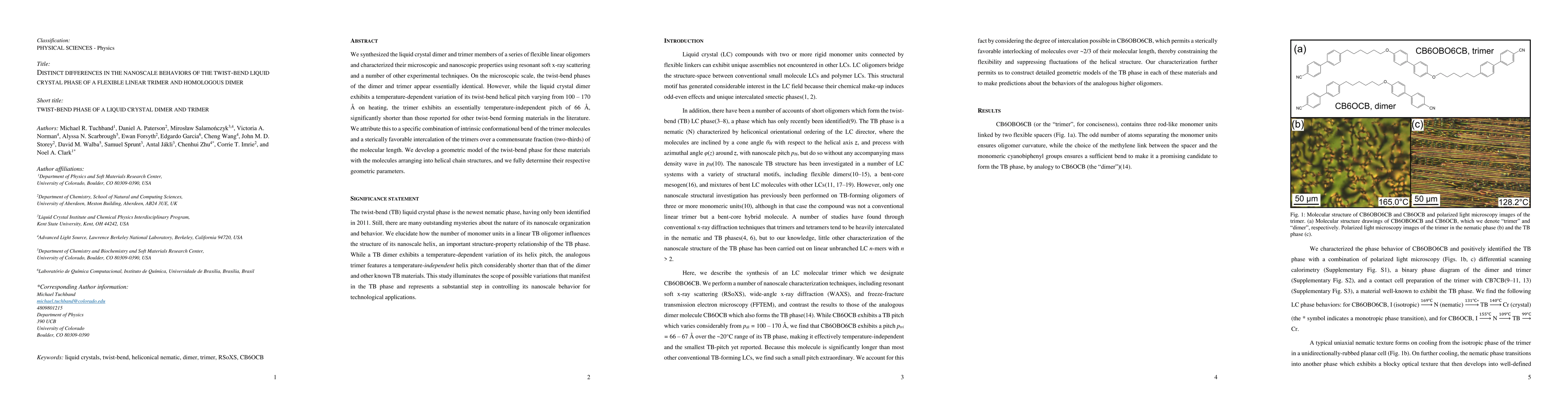 This paper investigates the nanoscale behaviors of twist-bend liquid crystal phases in flexible linear trimers and dimers, revealing that while both exhibit similar microscopic twist-bend phases, the trimer has a temperature-independent helical pitch of 66 Å, contrasting with the dimer's temperature-dependent pitch variation. The authors attribute this difference to the trimer's intrinsic conformational bend and favorable intercalation.