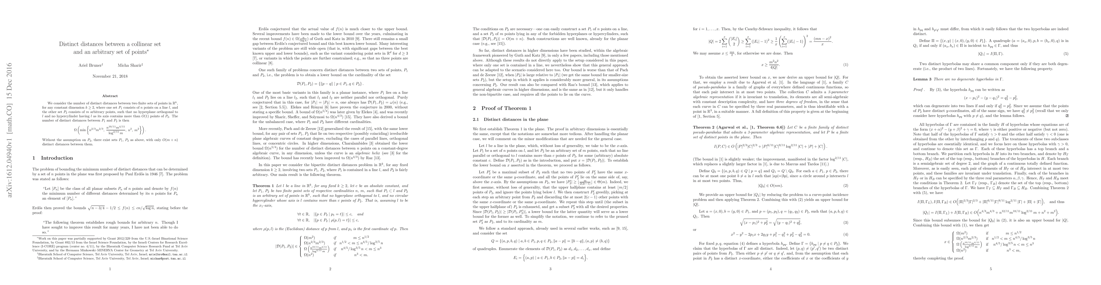 This paper investigates the number of distinct distances between a collinear set of points $P_1$ and an arbitrary set $P_2$ in ${\bf R}^k$. It establishes a lower bound for the distinct distances under certain constraints on $P_2$, showing that the number is $\Omega\left(\min\left\{ n^{2/3}m^{2/3},\; \frac{n^{10/11}m^{4/11}}{\log^{2/11}m},\; n^2,\; m^2\right\}\right)$. Without these constraints, the number of distinct distances can be as low as $O(m+n)$.