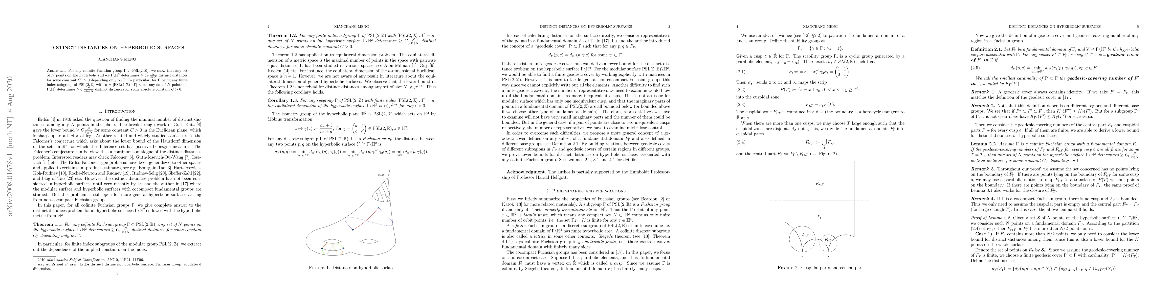 A set of N points on a hyperbolic surface determines at least C_{\Gamma} rac{N}{\log N} distinct distances for some constant C_{\Gamma}, where \Gamma is a specific group of transformations.