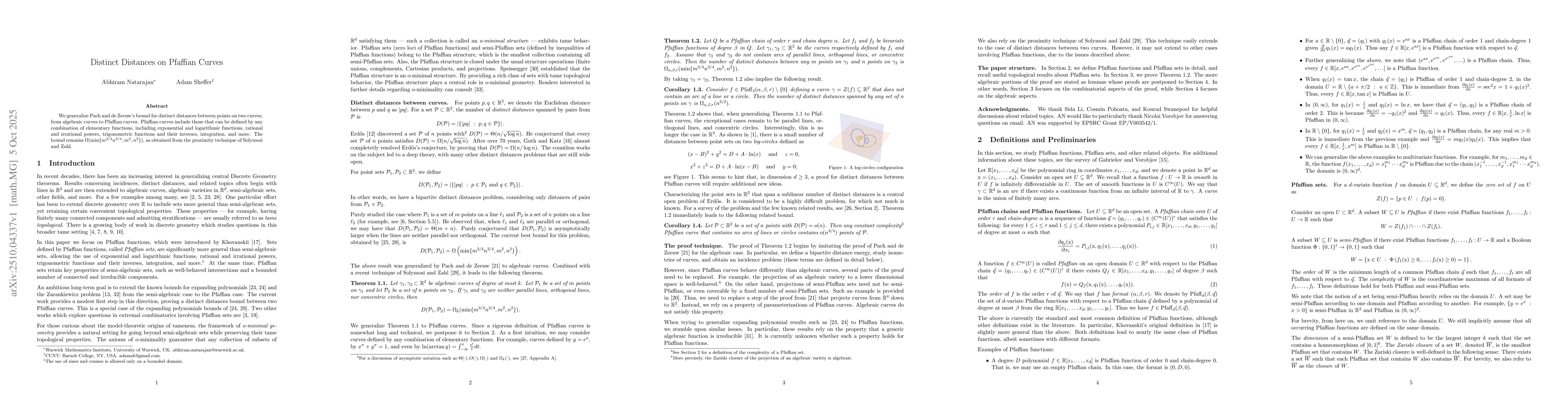 The research employs a combination of combinatorial geometry, algebraic methods, and incidence theory to analyze distinct distances on algebraic curves. It leverages polynomial vanishing techniques and extremal graph theory to derive bounds on distance configurations.
