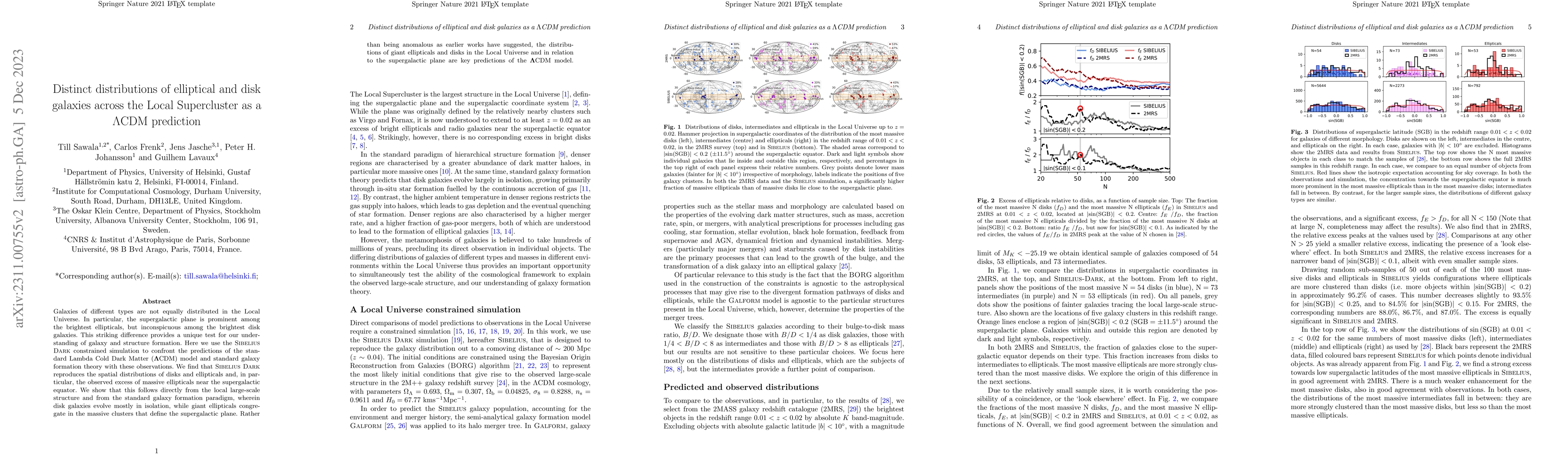 This paper uses the SIBELIUS DARK simulation to demonstrate that the $\Lambda$CDM model accurately predicts the distinct spatial distributions of elliptical and disk galaxies in the Local Supercluster, particularly the concentration of massive ellipticals near the supergalactic plane. These findings support the standard galaxy formation theory, showing that ellipticals form in clusters while disk galaxies evolve mostly in isolation.
