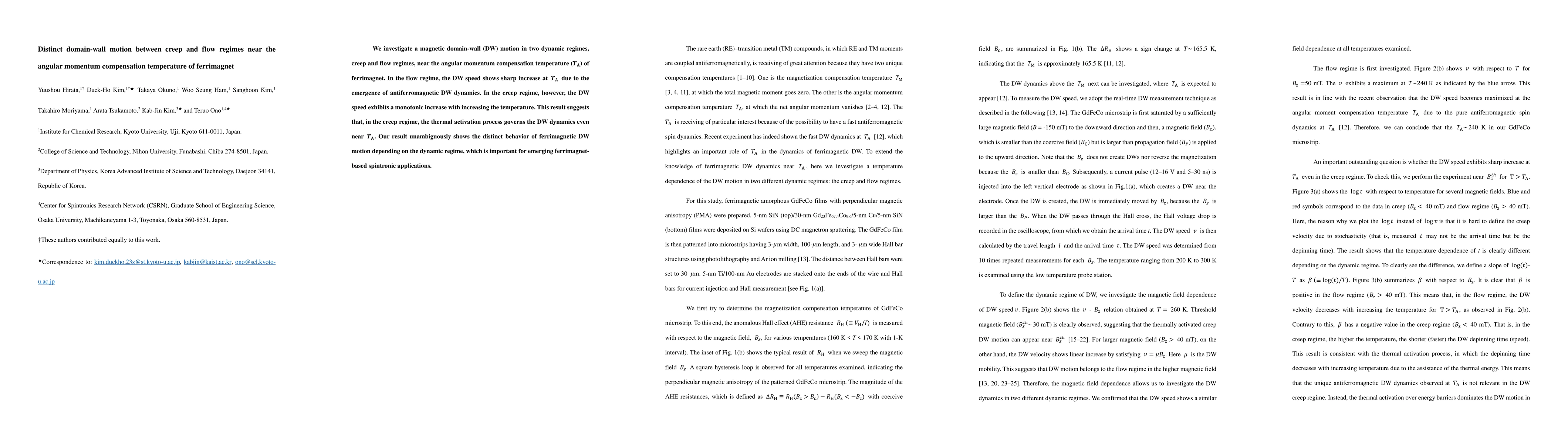 This study investigates magnetic domain-wall motion in ferrimagnets near the angular momentum compensation temperature, revealing distinct behaviors in creep and flow regimes. In the flow regime, domain-wall speed sharply increases at T_A due to antiferromagnetic dynamics, while in the creep regime, it increases monotonically, indicating thermal activation governs dynamics near T_A.