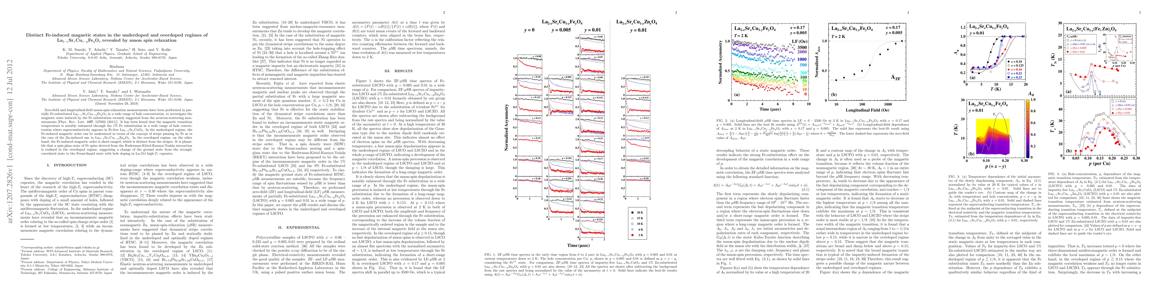 This study reveals distinct Fe-induced magnetic states in underdoped and overdoped La2-xSrxCu1-yFeyO4 using muon spin relaxation, showing enhanced magnetic transition temperatures with Fe substitution. The underdoped regime exhibits stripe pinning, akin to Zn, while the overdoped regime shows short-ranged magnetic order, possibly a spin-glass state, indicating a shift from a correlated state to a Fermi-liquid state with doping.
