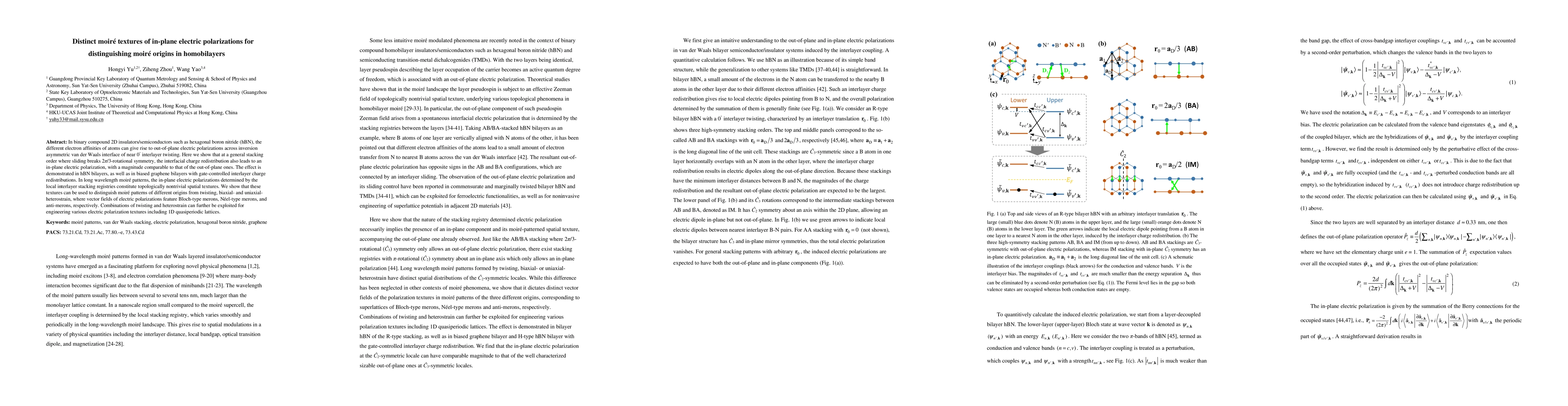 This paper demonstrates that in-plane electric polarizations arise in binary compound 2D materials like hBN bilayers due to interfacial charge redistribution, leading to distinct moiré textures. These textures can distinguish different moiré origins such as twisting, biaxial, and uniaxial heterostrain by revealing unique vector fields of electric polarization.