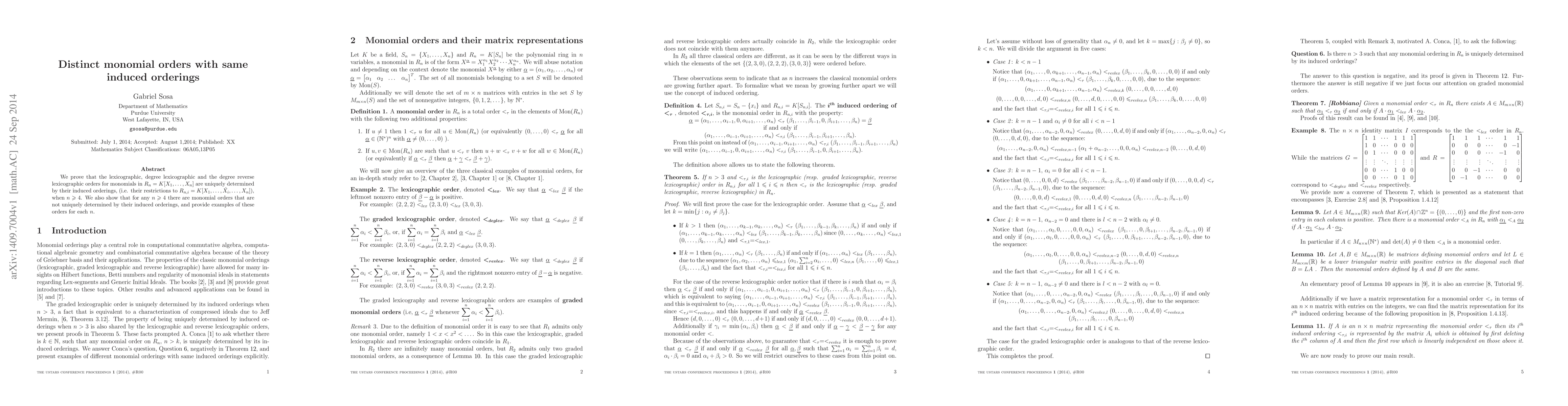 We prove that the lexicographic, degree lexicographic and the degree reverse lexicographic orders for monomials in $R_n=K[X_1,...X_n]$ are uniquely determined by their induced orderings, (i.e. their restrictions to $R_{n,i}=K[X_1,..., \hat{X_i}, .., X_n]$), when $n \geq 4$. We also show that for any $n \geq 4$ there are monomial orders that are not uniquely determined by their induced orderings, and provide examples of these orders for each $n$.