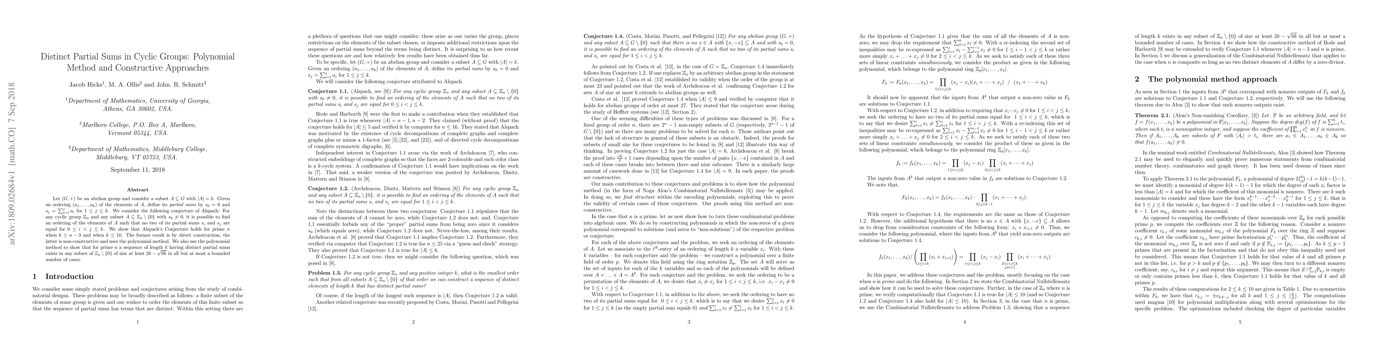 This paper investigates Alspach's Conjecture regarding distinct partial sums in cyclic groups. It proves the conjecture for prime n when the subset size k is at least n-3 via direct construction, and for k up to 10 using the polynomial method. Additionally, it demonstrates via polynomial method that for prime n, a sequence of distinct partial sums exists in any subset of size at least 2k - sqrt(8k) for most cases.