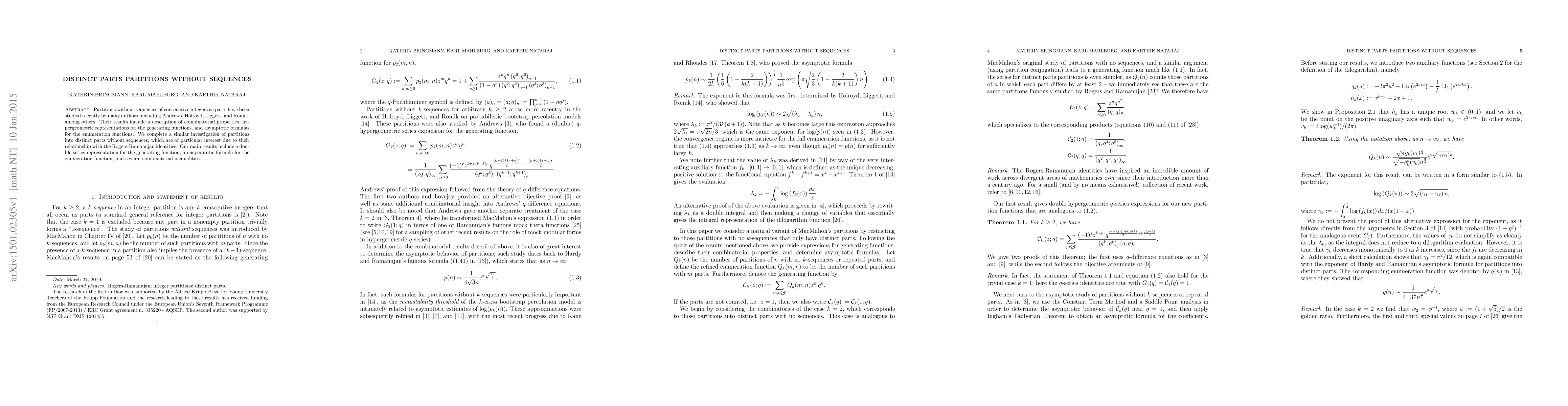 Partitions without sequences of consecutive integers as parts have been studied recently by many authors, including Andrews, Holroyd, Liggett, and Romik, among others. Their results include a description of combinatorial properties, hypergeometric representations for the generating functions, and asymptotic formulas for the enumeration functions. We complete a similar investigation of partitions into distinct parts without sequences, which are of particular interest due to their relationship with the Rogers-Ramanujan identities. Our main results include a double series representation for the generating function, an asymptotic formula for the enumeration function, and several combinatorial inequalities.