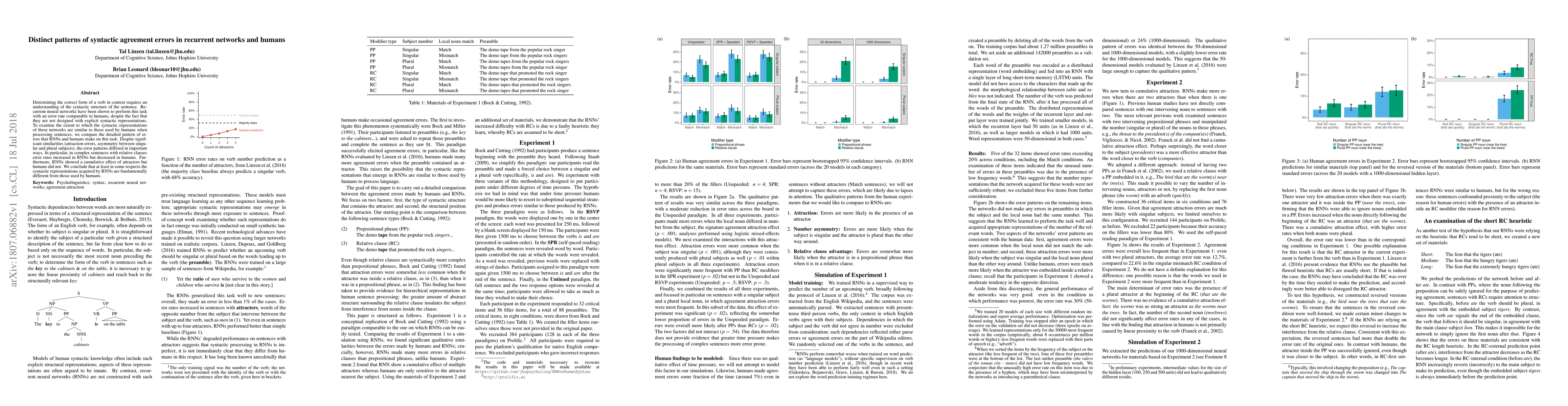 This paper compares the syntactic agreement errors made by recurrent neural networks (RNNs) and humans, finding significant similarities yet important differences, particularly in complex sentences with relative clauses where RNNs exhibit higher error rates and a cumulative effect of attractors, unlike humans.