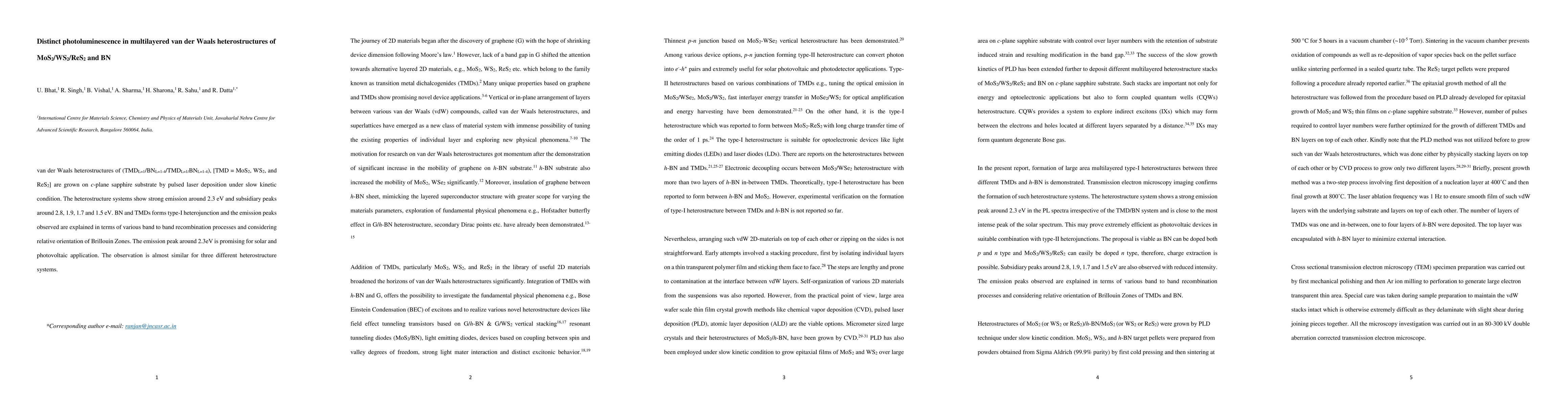 This paper investigates multilayered van der Waals heterostructures of MoS2/WS2/ReS2 with BN grown on sapphire, revealing distinct photoluminescence with strong emission peaks around 2.3 eV, 2.8 eV, 1.9 eV, 1.7 eV, and 1.5 eV. The 2.3 eV peak is particularly promising for solar and photovoltaic applications.