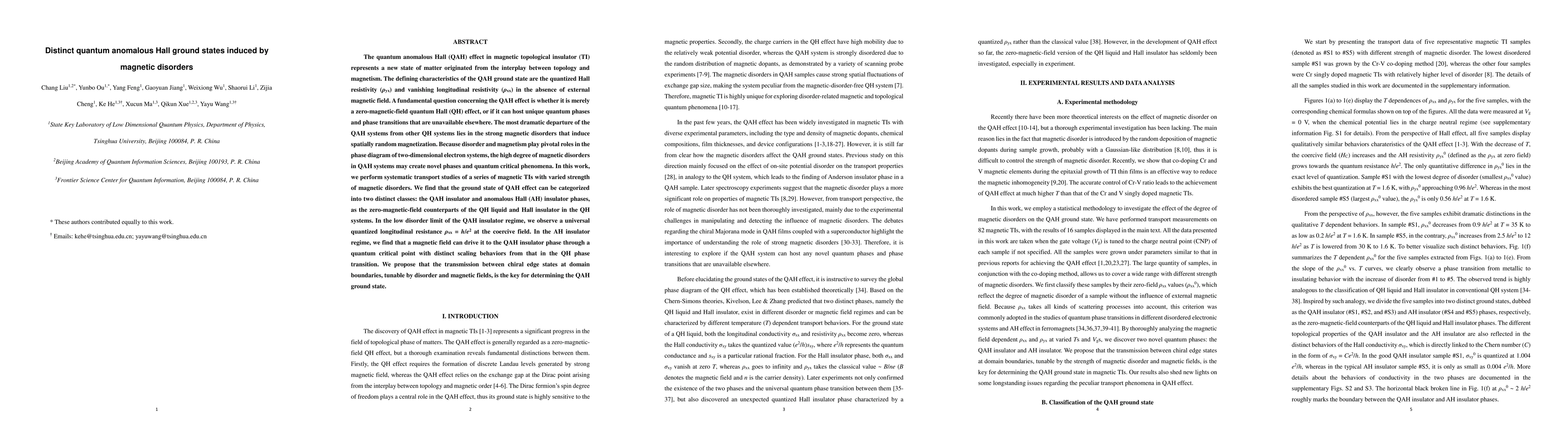 The quantum anomalous Hall (QAH) effect in magnetic topological insulator (TI) represents a new state of matter originated from the interplay between topology and magnetism. The defining characteristics of the QAH ground state are the quantized Hall resistivity ($\rho_{yx}$) and vanishing longitudinal resistivity ($\rho_{xx}$) in the absence of external magnetic field. A fundamental question concerning the QAH effect is whether it is merely a zero-magnetic-field quantum Hall (QH) effect, or if it can host unique quantum phases and phase transitions that are unavailable elsewhere. The most dramatic departure of the QAH systems from other QH systems lies in the strong magnetic disorders that induce spatially random magnetization. Because disorder and magnetism play pivotal roles in the phase diagram of two-dimensional electron systems, the high degree of magnetic disorders in QAH systems may create novel phases and quantum critical phenomena. In this work, we perform systematic transport studies of a series of magnetic TIs with varied strength of magnetic disorders. We find that the ground state of QAH effect can be categorized into two distinct classes: the QAH insulator and anomalous Hall (AH) insulator phases, as the zero-magnetic-field counterparts of the QH liquid and Hall insulator in the QH systems. In the low disorder limit of the QAH insulator regime, we observe a universal quantized longitudinal resistance $\rho_{xx} = h/e^{2}$ at the coercive field. In the AH insulator regime, we find that a magnetic field can drive it to the QAH insulator phase through a quantum critical point with distinct scaling behaviors from that in the QH phase transition. We propose that the transmission between chiral edge states at domain boundaries, tunable by disorder and magnetic fields, is the key for determining the QAH ground state.