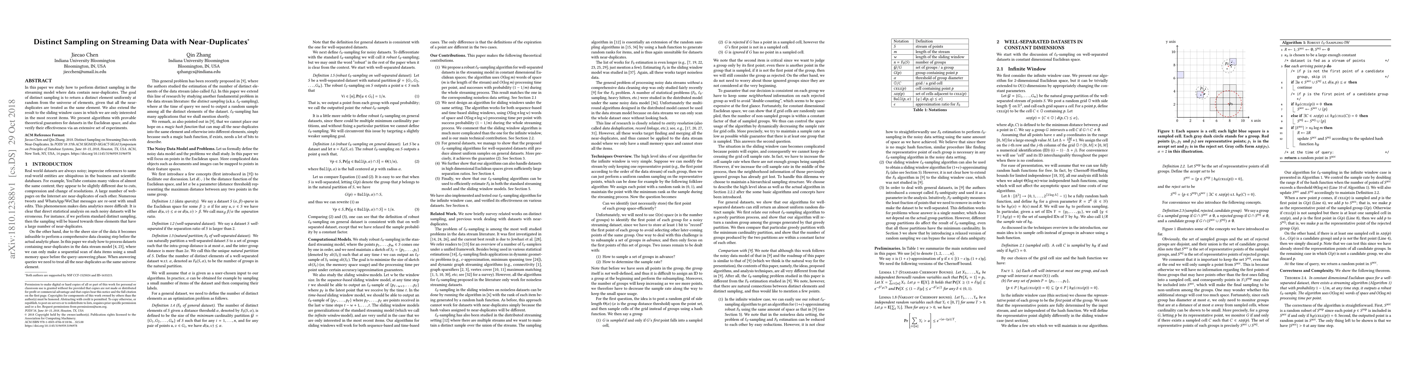 This paper proposes algorithms for distinct sampling in streaming data with near-duplicates, ensuring uniform random selection of unique elements, and extends the approach to sliding windows. Theoretical guarantees and empirical validation are provided for datasets in Euclidean space.