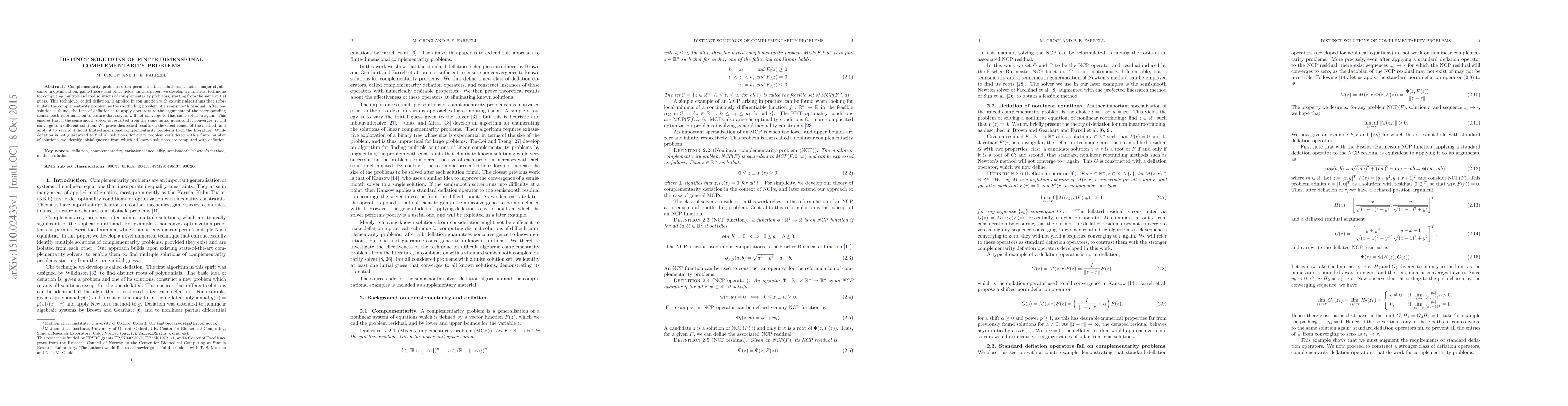 Complementarity problems often permit distinct solutions, a fact of major significance in optimization, game theory and other fields. In this paper, we develop a numerical technique for computing multiple isolated solutions of complementarity problems, starting from the same initial guess. This technique, called deflation, is applied in conjunction with existing algorithms that reformulate the complementarity problem as the rootfinding problem of a semismooth residual. After one solution is found, the idea of deflation is to apply operators to the arguments of the corresponding semismooth reformulation to ensure that solvers will not converge to that same solution again. This ensures that if the semismooth solver is restarted from the same initial guess and it converges, it will converge to a different solution. We prove theoretical results on the effectiveness of the method, and apply it to several difficult finite-dimensional complementarity problems from the literature. While deflation is not guaranteed to find all solutions, for every problem considered with a finite number of solutions, we identify initial guesses from which all known solutions are computed with deflation.