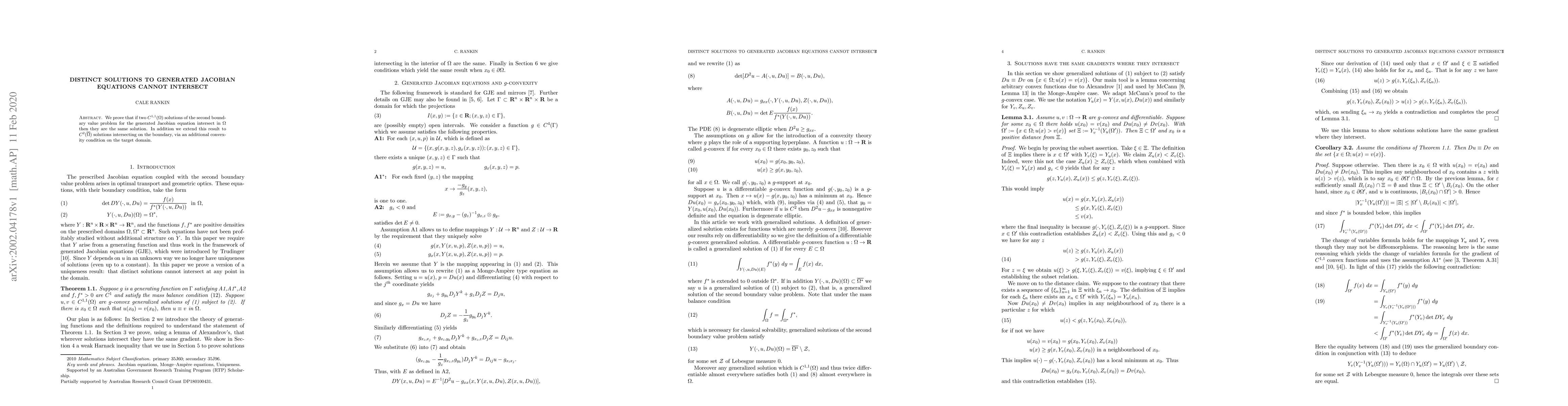 We prove that if two $C^{1,1}(\Omega)$ solutions of the second boundary value problem for the generated Jacobian equation intersect in $\Omega$ then they are the same solution. In addition we extend this result to $C^{2}(\overline{\Omega})$ solutions intersecting on the boundary, via an additional convexity condition on the target domain.